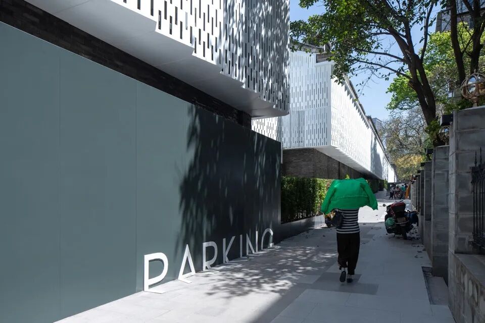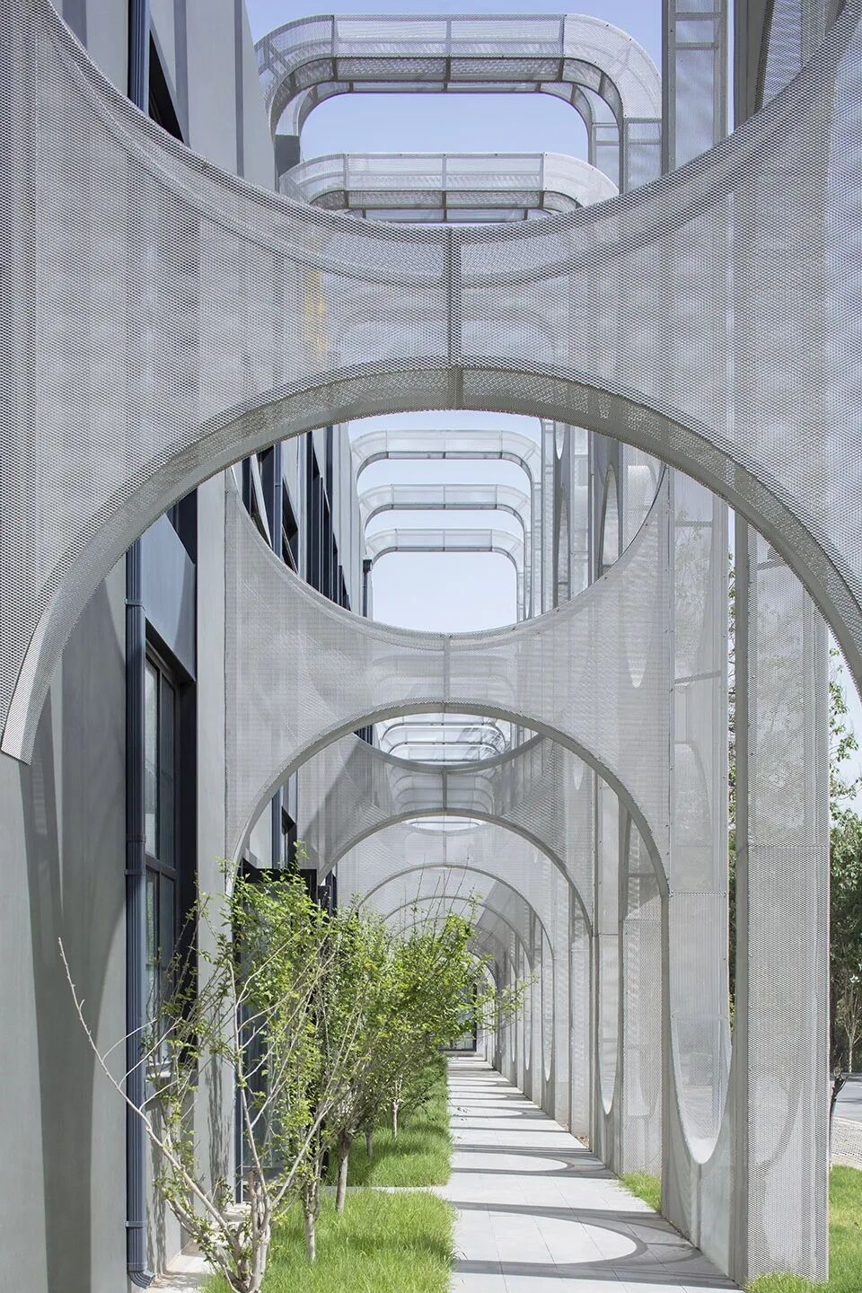 从景观到建筑表皮,工业钢网的使用赋予了建筑造型的硬与软的两种特质。凸出的半弧形阳台与展示橱窗增加了建筑表面的立体性与韵律。