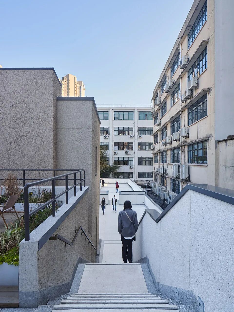 在保留街区肌理、有限度地改造建筑单体的基础上,设计依据使用需求于厂房内部置入一组新的体量以扩大使用面积。新置入的体量通过向外伸展平台、连廊等,将几组分散的建筑勾连成为一个整体。