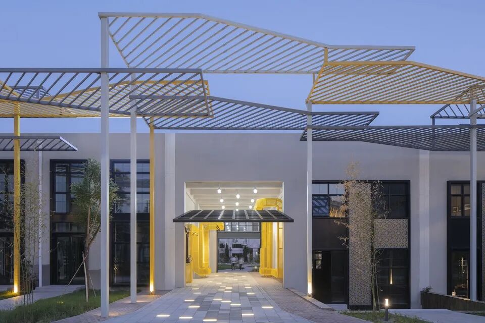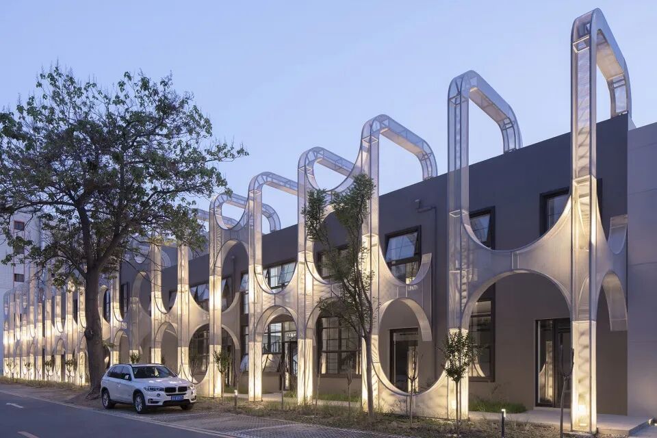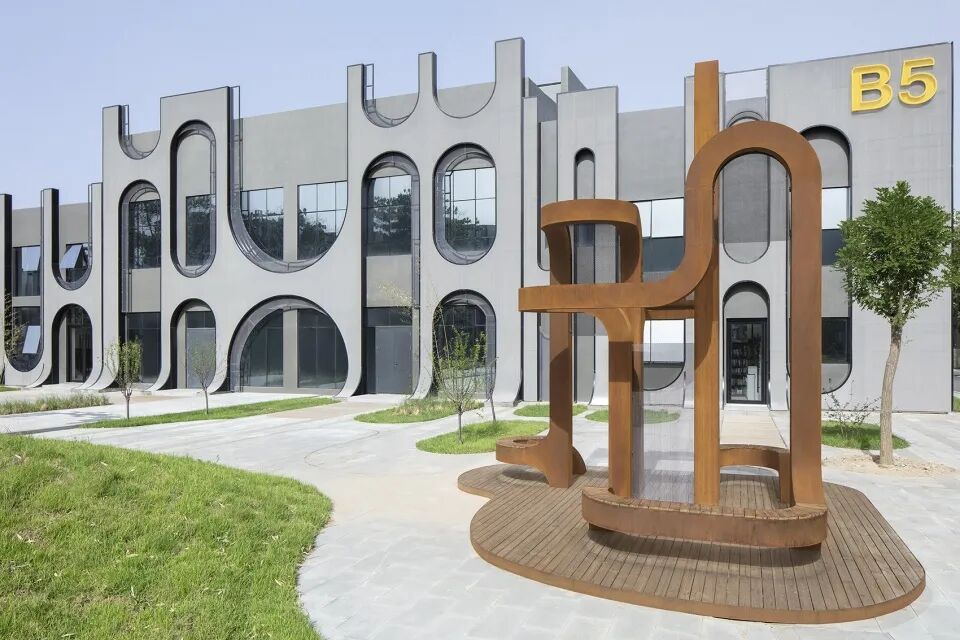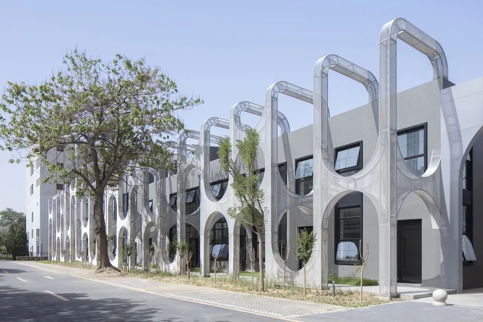 北京Fashion Factory的B庭院是整个园区的最“时尚实验性“的设计。整个庭院的建筑立面与景观造型一体是一个独特环境与语言,通过针脚编织的概念,三面围合的建筑外墙的线条与拱门的运用创造了空间的连续线性, 将一座建筑的立面造型轮廓与景观的曲线轮廓缝合在一起。这些简单和重复的造型可以引发强烈的节奏感, 使眼睛能够从景观到立面和背面进行追踪,同时还利用了一套简单的零件套件,以便于制造和施工。