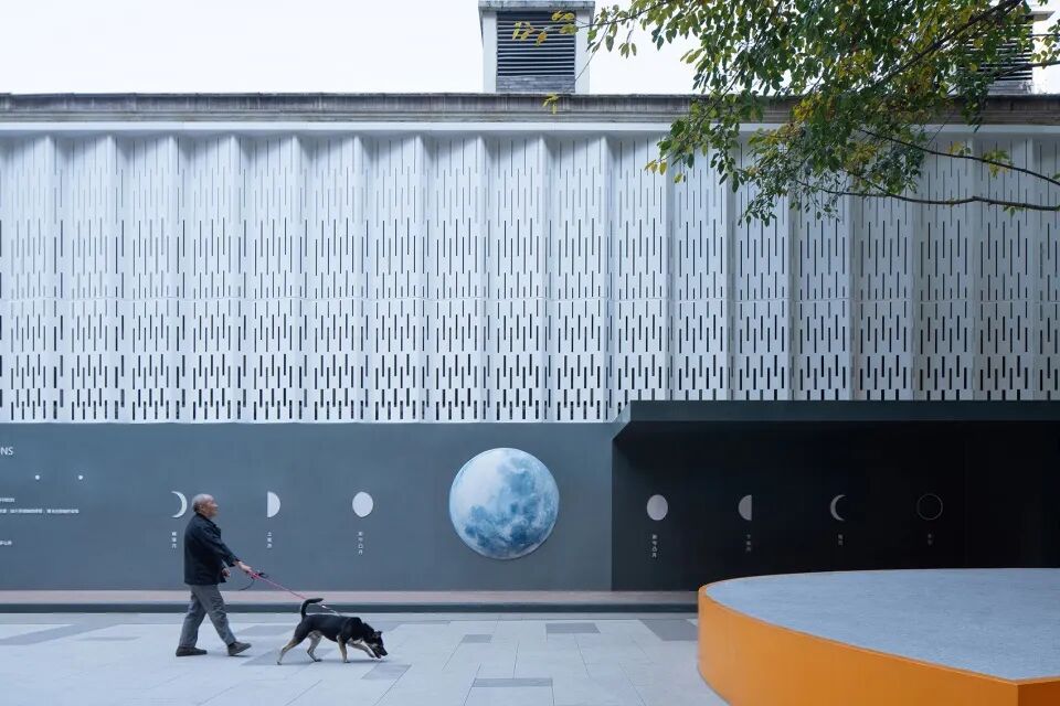 月影墙的设计灵感来源于万州本地人们小时候对江面月影的记忆。把月亮倒影作为一个连接纽带,让本地居民在这里唤起过去的记忆,能够得到更多的东西。月亮墙还有着科普的功能,让更多的人了解并在这里打卡,我们在景墙上做了上玄月下玄月等月亮阴晴圆缺的变化。月亮也唤起人们的乡愁,对街巷的过去产生回忆与遐想。