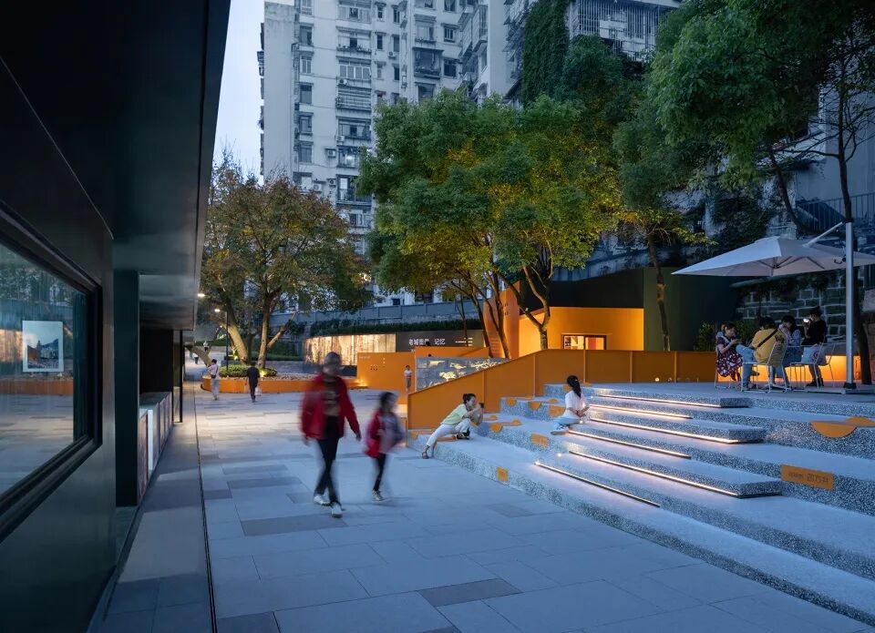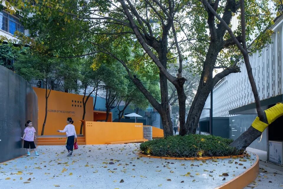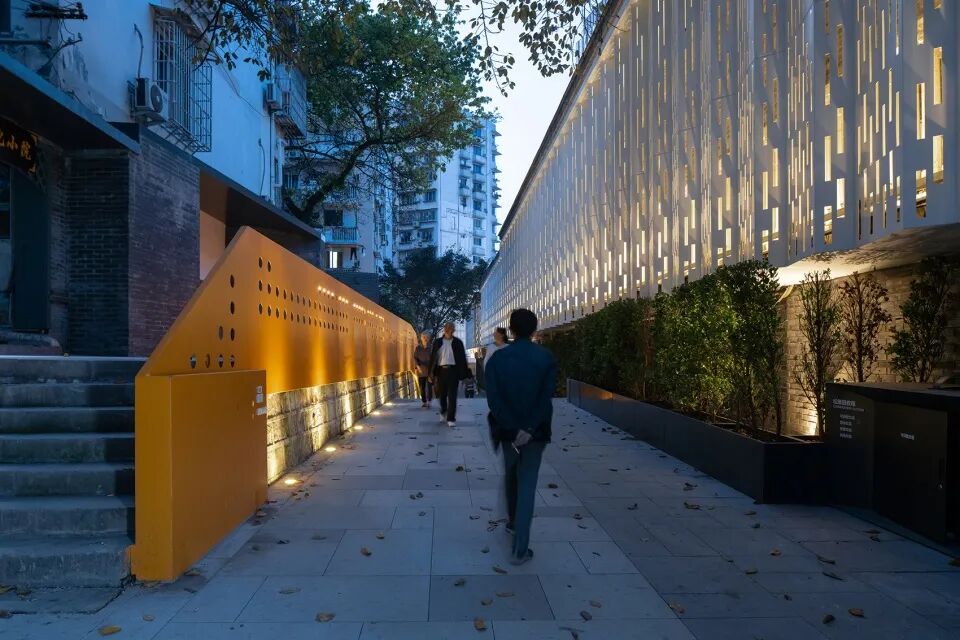 设计基于现状出发,保留了大量老的基底,对场地原有结构、树木保留,进行重新解读与包装,围绕现有的黄葛树打造月光剧场,城市书屋和览书一隅等空间。将原本杂乱的、消极的空间进行新的诠释。不仅满足原有居民的生活功能,服务于本地市民生活活动。还增加更多可能性的场地功能,以吧台和坐凳的形式,呈现室外书吧这样的小空间及外摆空间,提高空间的利用率,为人们提供停留、交谈、活动的休闲平台。让本地居民在这个空间里唤起记忆,延续他们原有的生活方式同时满足更多年轻人的审美喜好。