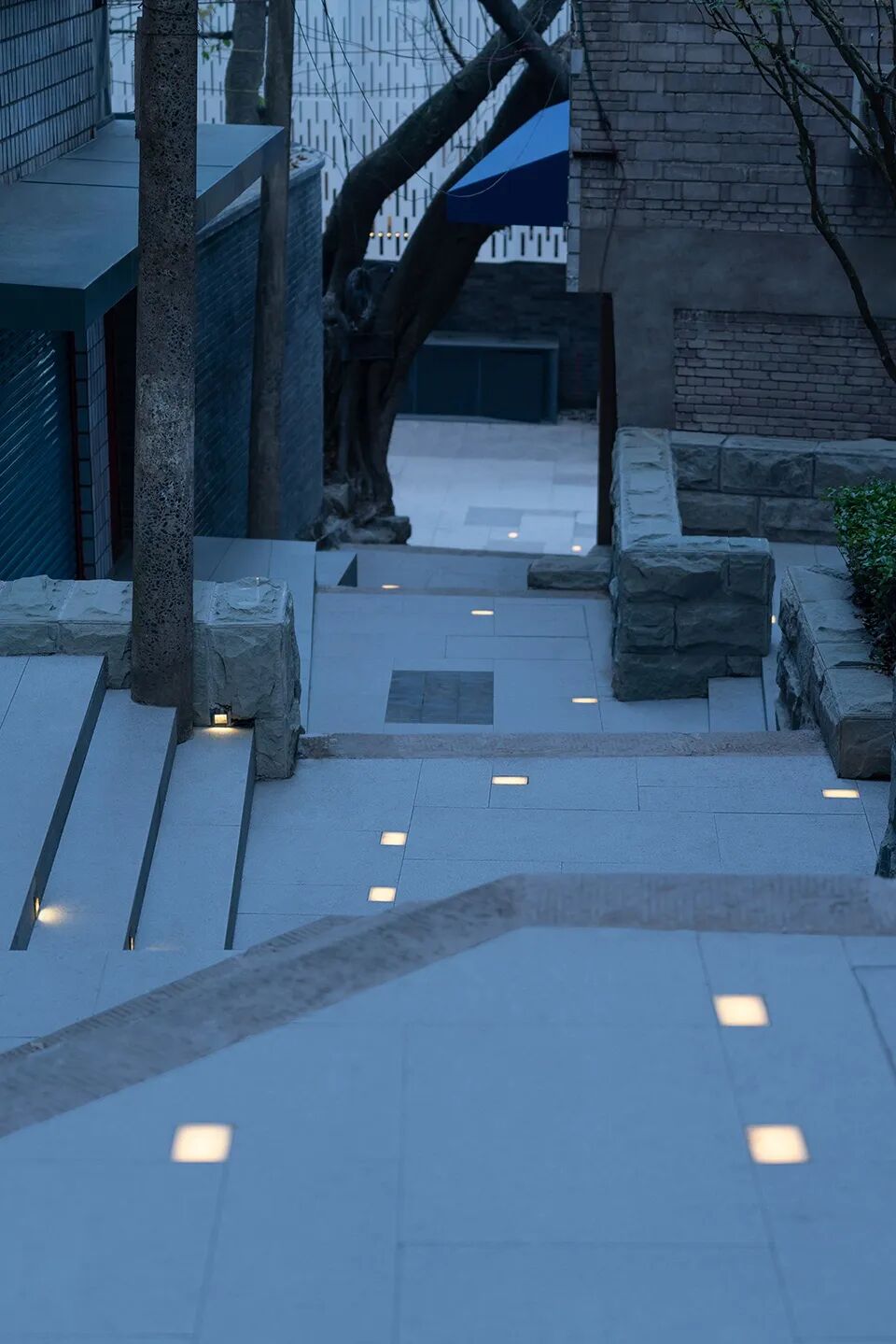 对于街巷的生活记忆,巷道随处可见的老基底文化,青石,台阶与空间属性是我们不能设计出来的历史痕迹。通过留改甄别保留街巷肌理和人行尺度,发光玻璃砖作为入口的引导。