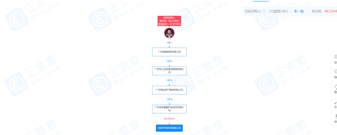 根据企查查股权穿透显示,合创汽车最大的股东为“广东珠投智能科技投资有限公司”,实际控制人为朱一航,而朱一航同时也是EDG俱乐部创始人。朱一航的父亲为合生创展集团创始人,其家族排名2021胡润全球富豪榜312位。