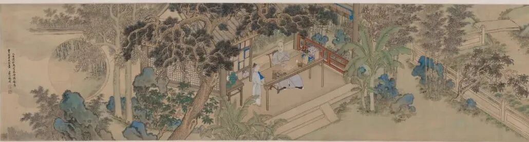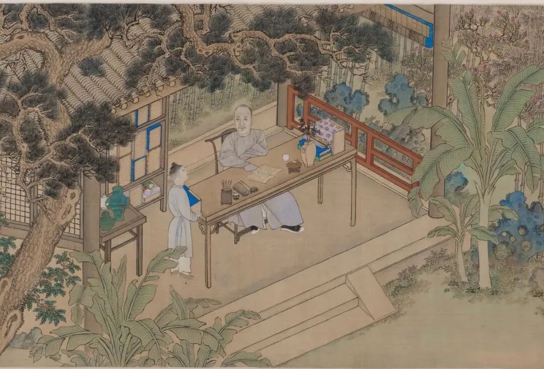 史贻直(公元1682~1763年)为清代官员、学者,谥“文靖”,他坐在院内书房的书桌前,庭院满目青葱,明显是一处达官显贵的豪宅深院。