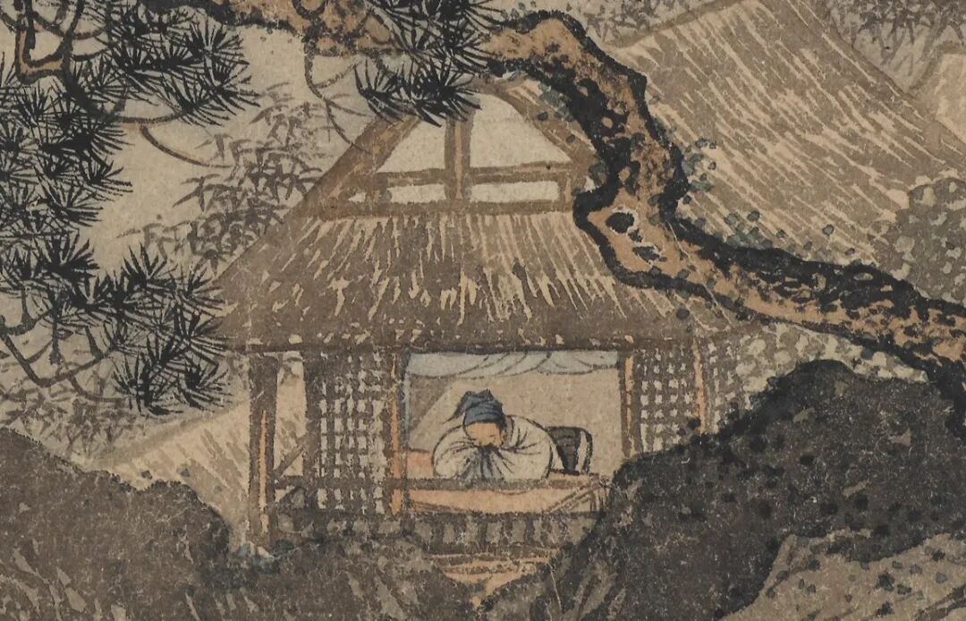 此画所绘主题即东原先生在山中书房小寐,书房在此处的意义即为梦而生,亦促使所梦之境的实现。对学者而言,山中是建造书房的理想场所,山水画中也常见此题材。