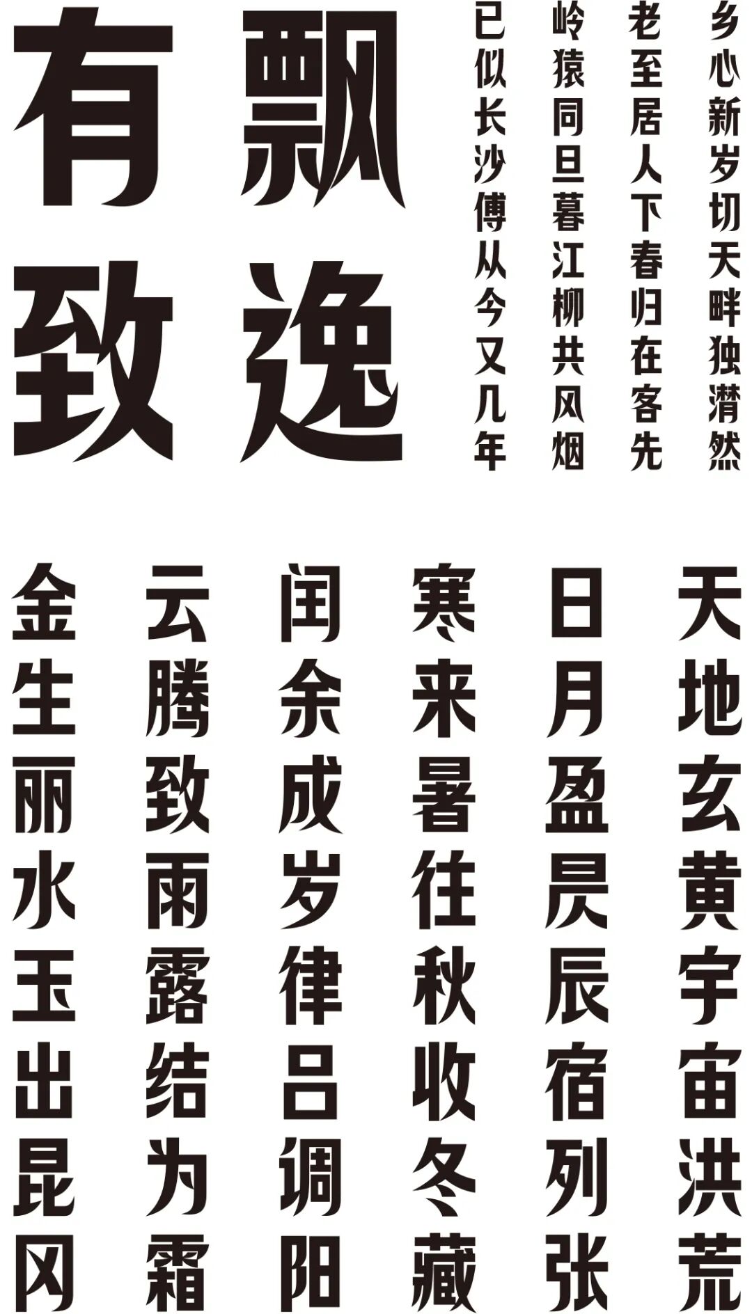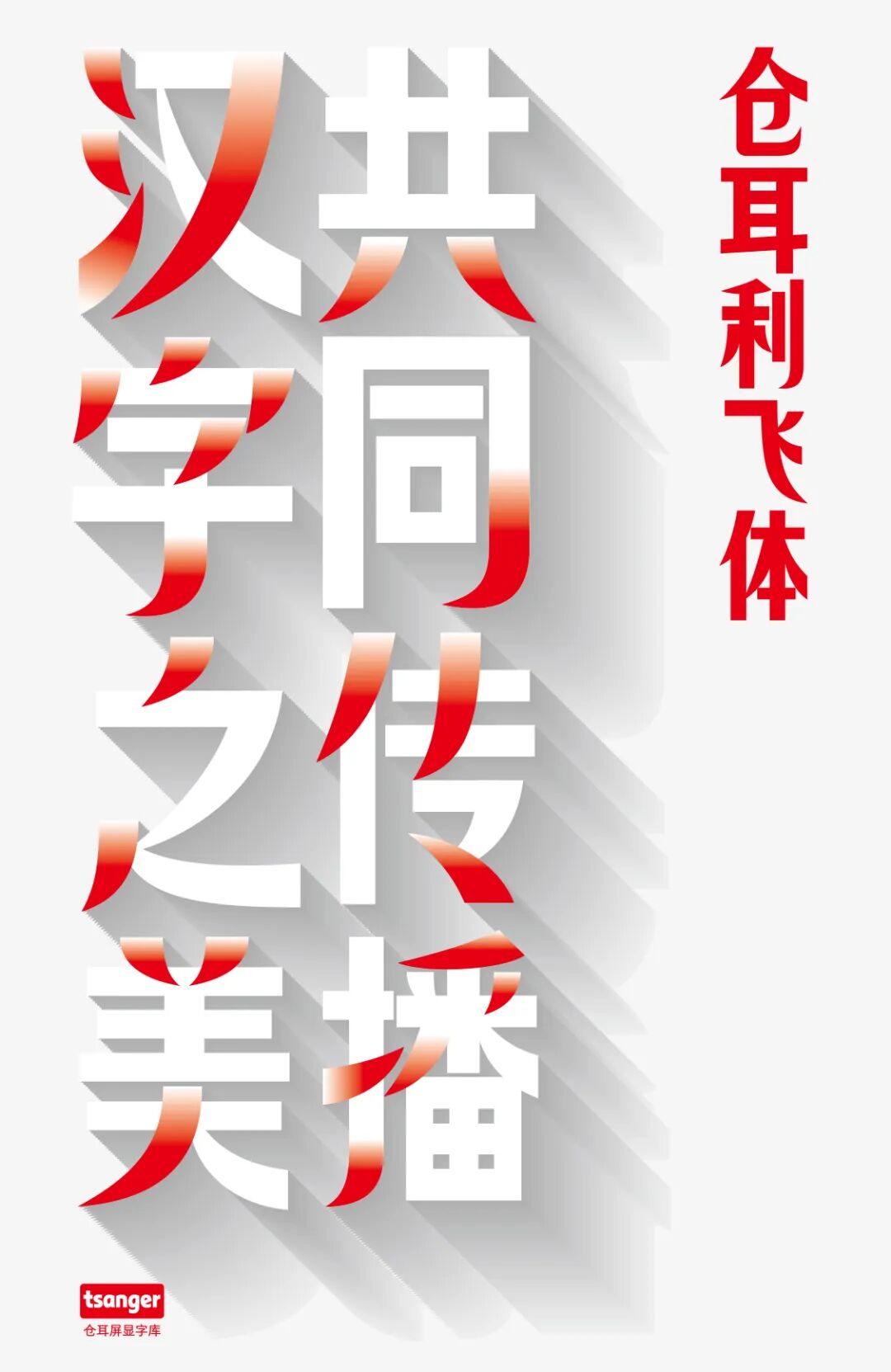 仓耳利飞体灵感来源于老美术字,其特点是用矩形和弧形两种视觉元素来组建字的各个部件,横竖笔画多采用笔直的矩形,撇捺则用弧形,体现出楚楚有致,舒展飘逸的特点。