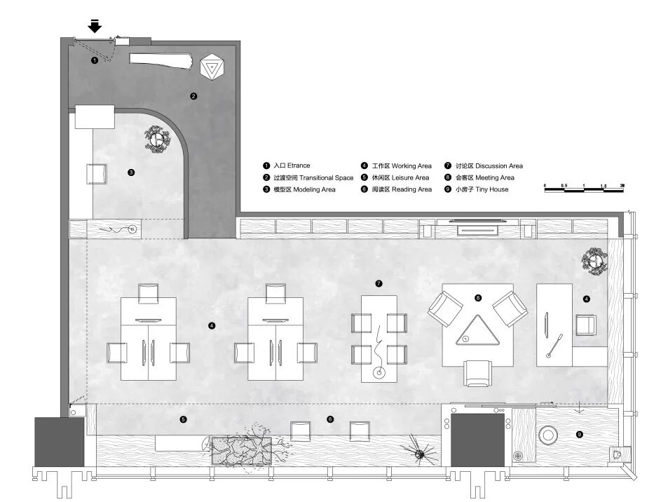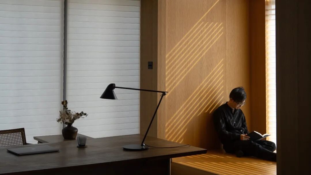 大家具靠近落地窗一侧,变形为了通长的阅读桌,减小后的窗洞令室内光线相对柔和。长桌中嵌入种植箱,在此种下的一棵石斑木,成为了从入口空间进入后的视线焦点,也为工作室引入花开花落的四时变换。