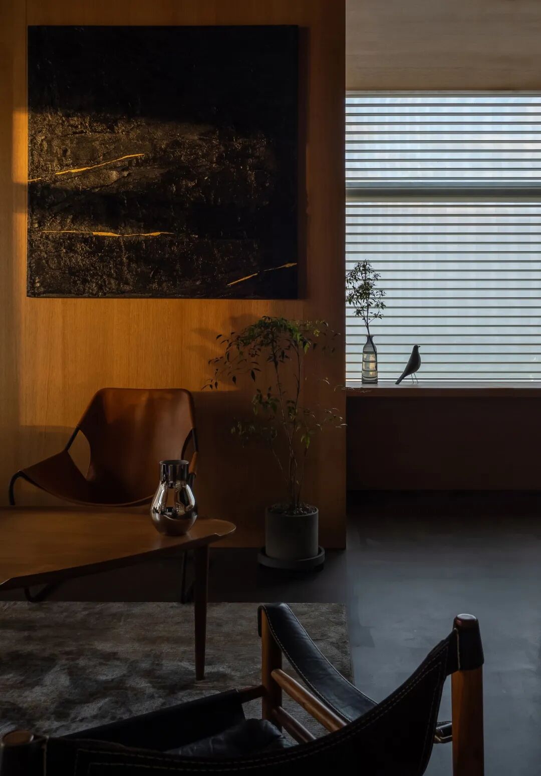 我们通过吊顶适当压低了过渡空间的尺度,并采用黑色微水泥材质整体覆盖。将走道尽端自然光线的渗入与暖光源照明相结合,营造出了冷暖交迭的静谧氛围。此外,黑色的空间本身也非常适合工作模型的取景拍照。