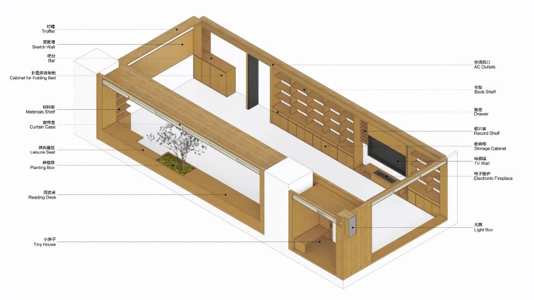 大家具在工作区和模型区之间,转化为吧台的形式做适当分隔,1.2米的高度使平日在吧台上放置模型进行观察时,免受弯腰之苦。而吧台下方的储物柜刚好可以收纳午休折叠床。