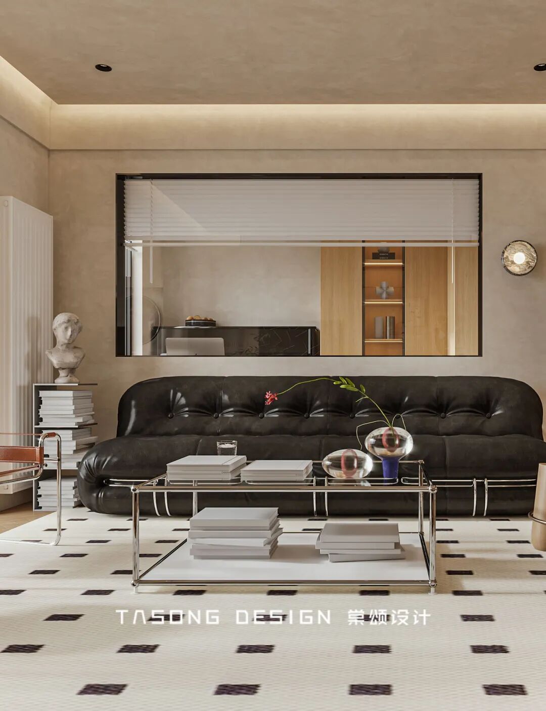 The black Bauhaus sofa and metal framed tea table are selected to easily enhance the artistic atmosphere of the whole space. The black window frame behind echoes the texture of the sofa and single chair.