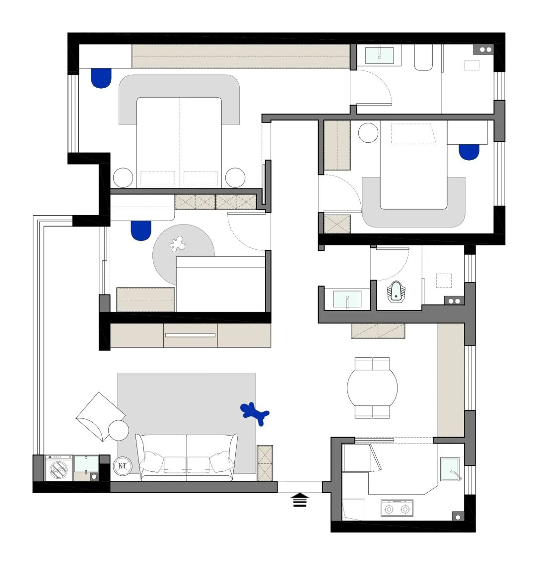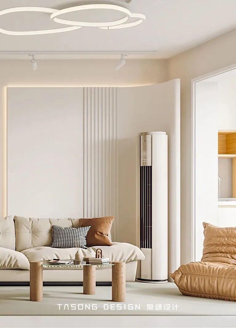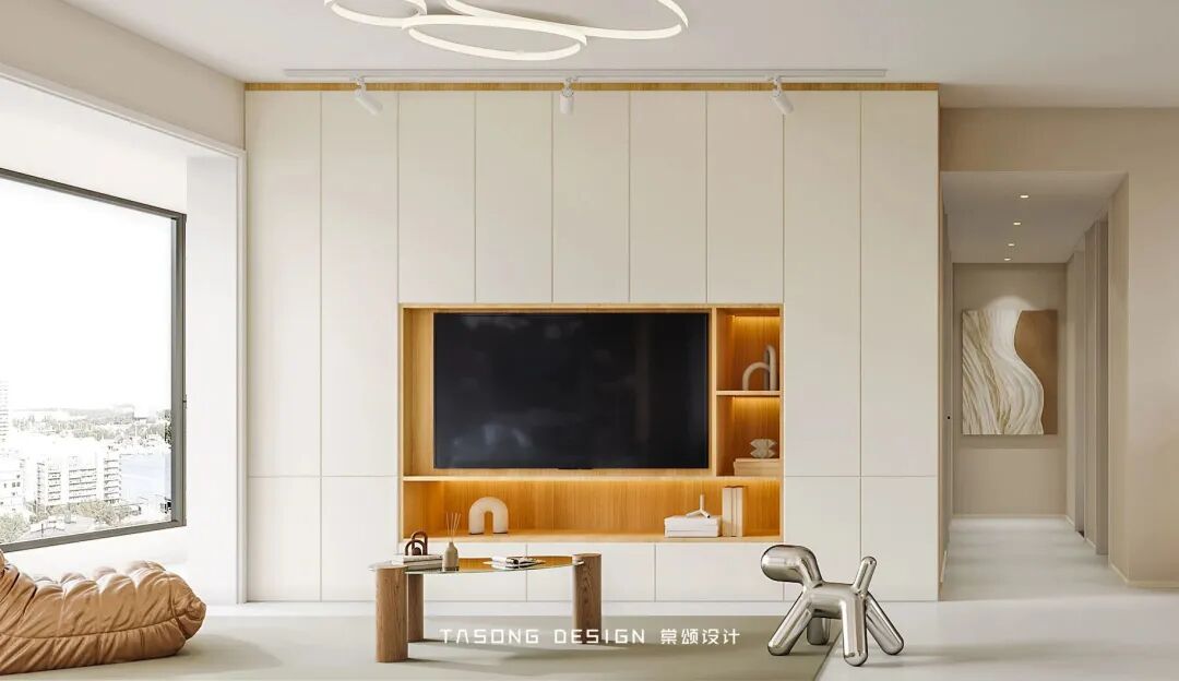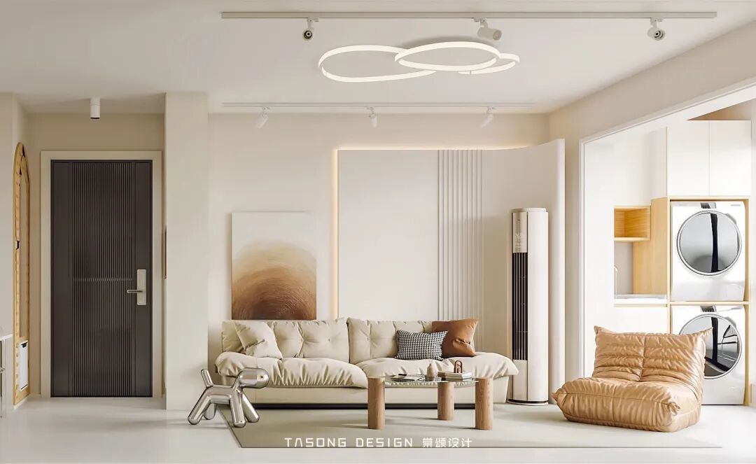 With the main line of simplicity and the use of log materials, the space is simple and warm, reflecting the healing and comfort of the home. The living room integrates the balcony in the space. The large French windows are good at introducing light. The sofa background has a semi-arc shape, which is good for contacting a group of cabinets in the washing and drying area. It is more soft in vision. With the soft cloud sofa, the whole space is comfortable and warm.