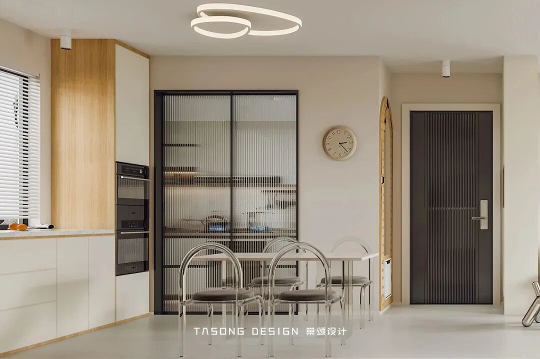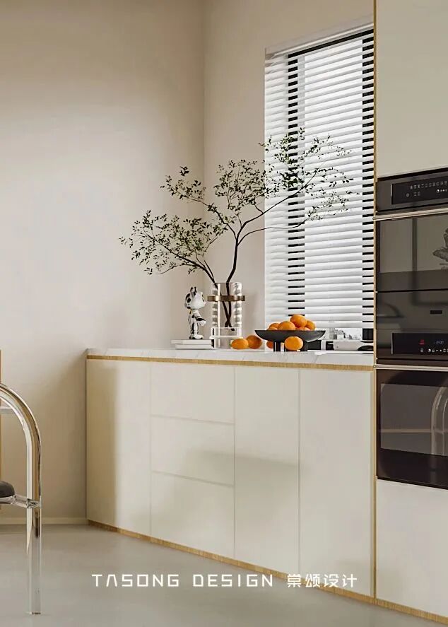 The operation desk on one side of the western kitchen space is convenient for daily steaming and baking. The hostess makes dessert afternoon tea here, and a pair of children study or play with toys on the table. Such is the happiness in ordinary life.