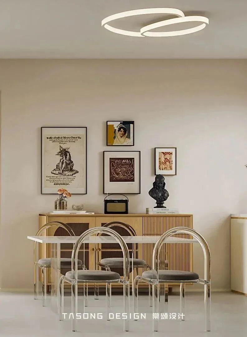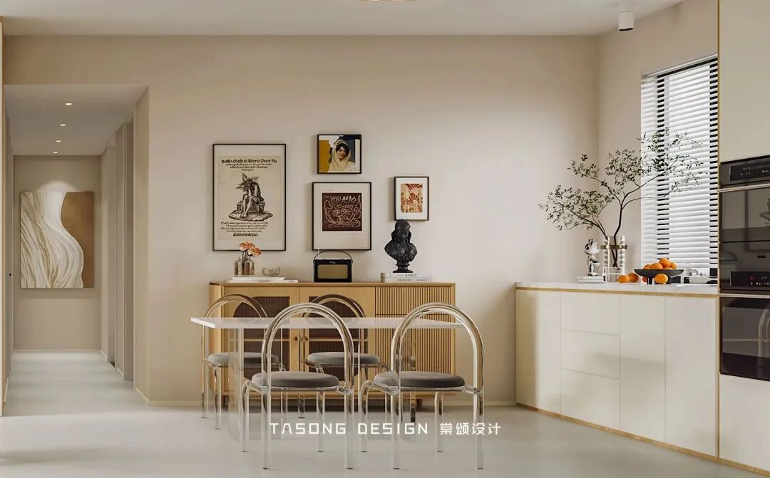 餐厅和西厨区域联合在一起,在功能使用和餐厨收纳上更加的丰富和多元化,搭配一组原木的餐边柜,用于摆放一些精致的小摆件或者收藏的各样小物,使得整个餐厨空间更加的丰富。