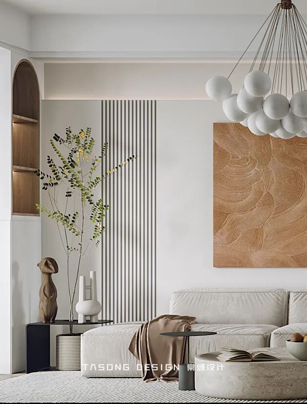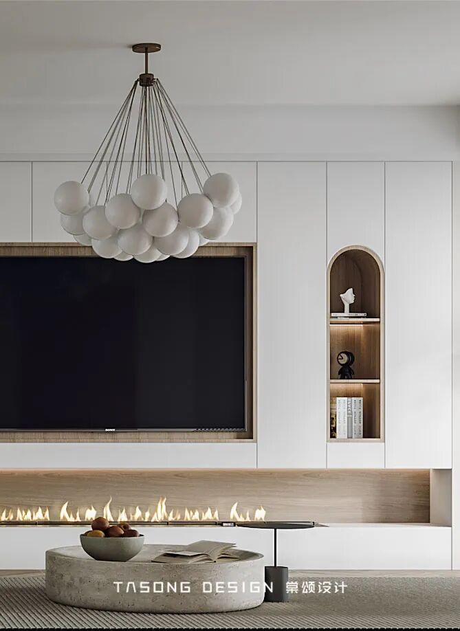 On the basis of white, warm color materials are added to add a sense of space hierarchy. The semi arc shape of the sofa background overlaps with the arc storage display grid of the TV background. Arc elements are used in many parts of the space, and soft white yarn is used to make the whole space more beautiful and comfortable, allowing people to return to the slow rhythm and comfortable atmosphere from the busy work.