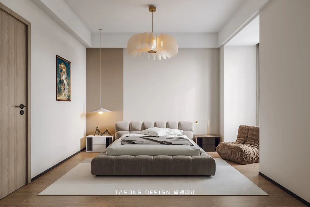 The master bedroom continues the design style of the living room, and the most intuitive feeling when entering the bedroom is the soft and comfortable feeling created by color and material. The background wall uses simple color block matching to enhance the sense of space hierarchy, the blank wall creates the lightness and breathability of the secondary bedroom space, and the color matching of flesh brown color adds a lively and bright feeling to life.