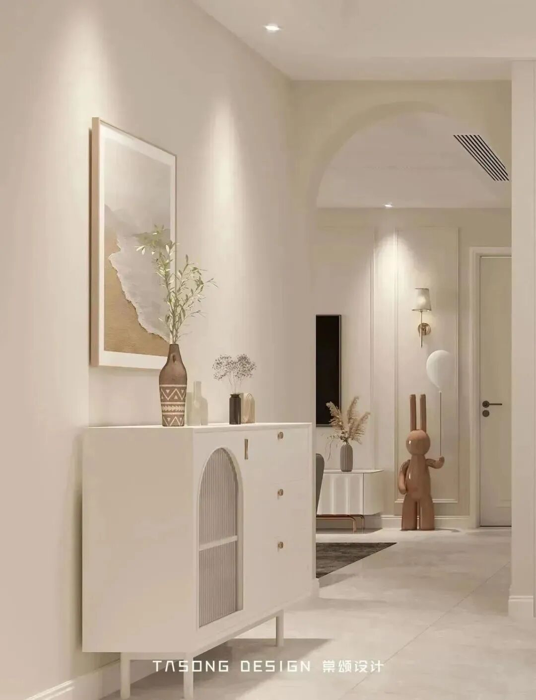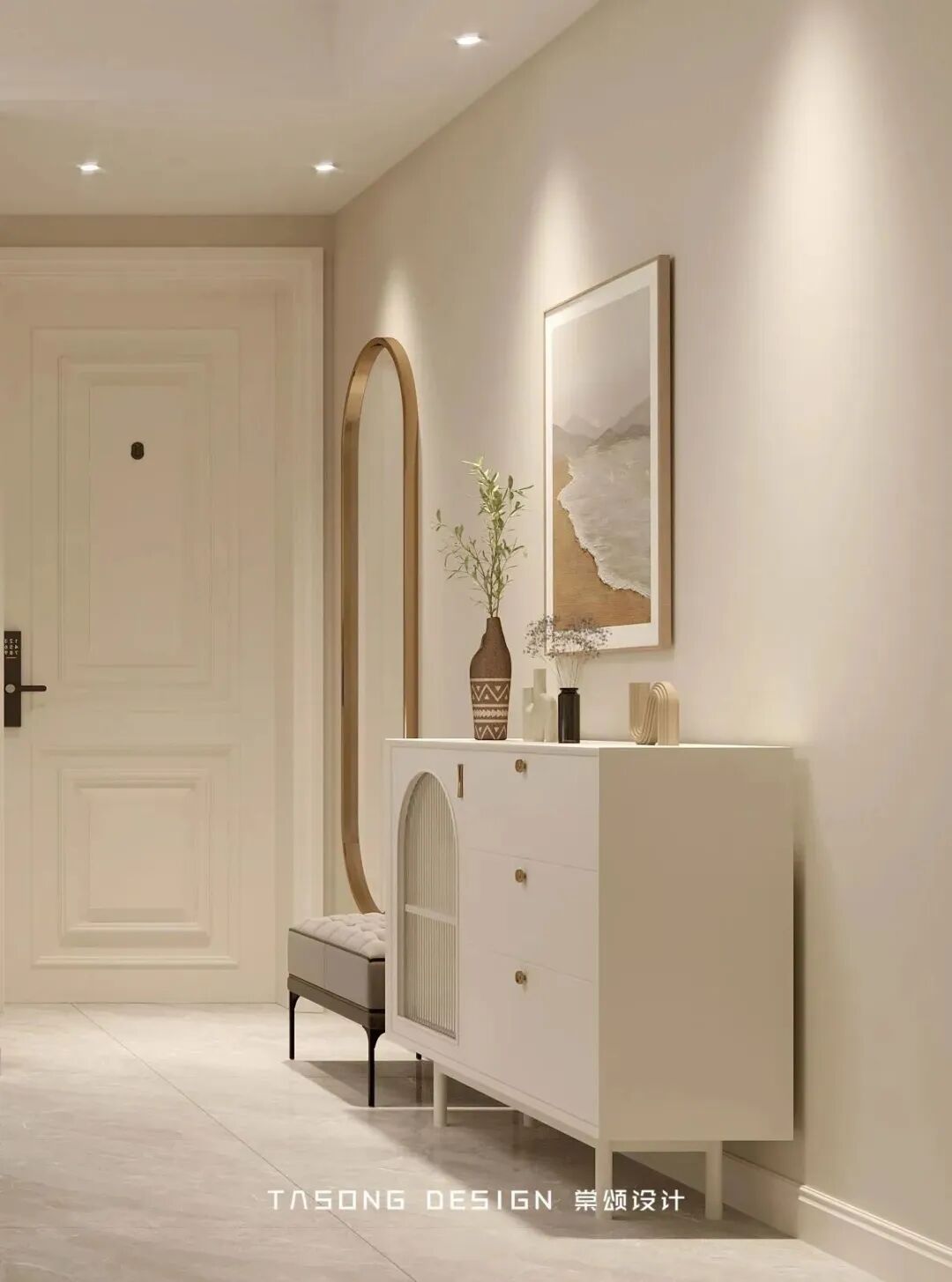 一进入入户门,映入眼帘的是一组换鞋凳+边柜组合,用于收纳日常的鞋子和放置随手的物品,换鞋凳搭配全身镜组合,真的是家庭必备了,奶白色+金色,温柔又精致,低调的奢华感。