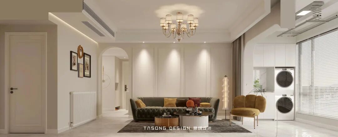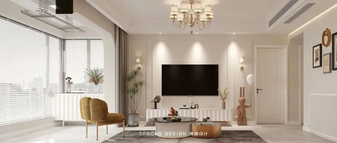 The whole space uses soft cream series colors, integrated with low saturation color soft decoration, to improve the sense of hierarchy of the space, bring bright visual feeling to the space, open up the balcony space, and make the originally relatively small living room space more transparent and spacious. A bunch of sunshine running through the blinds is naughty and lovely, shining on the sofa and the floor, warm and comfortable.
