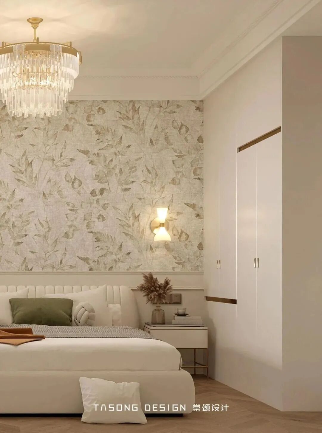 The elegant wallpaper of the master bedroom space is matched with the half-wall parapet, with the large crystal lamp, the dreamy princess room has both visual sense, the plain curtain increases the calm feeling of the space, and the floating window is connected with the table for daily reading and dressing, which is full of temperament and romance.