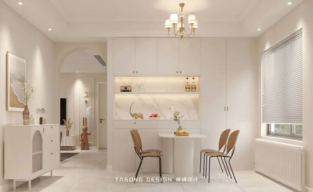 The designer has designed a group of sideboards beside the dining table. While increasing the storage, the exposed marble partition has both design sense and practicality. The kitchen door adopts the grid old steel window, which is retro and exquisite, and has also become a highlight of the home, and the overall aesthetic presentation is just right.
