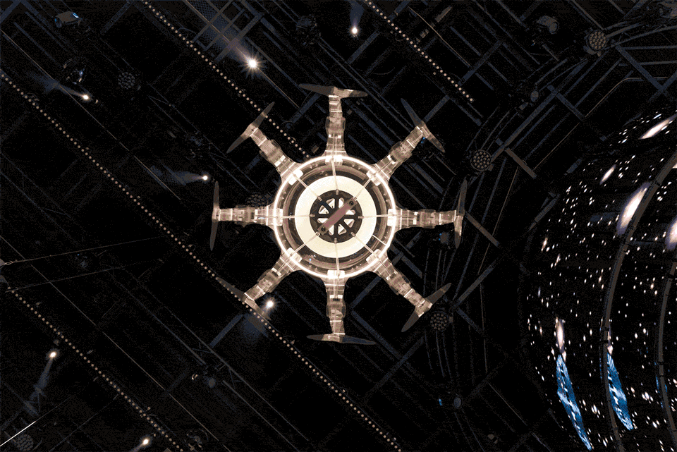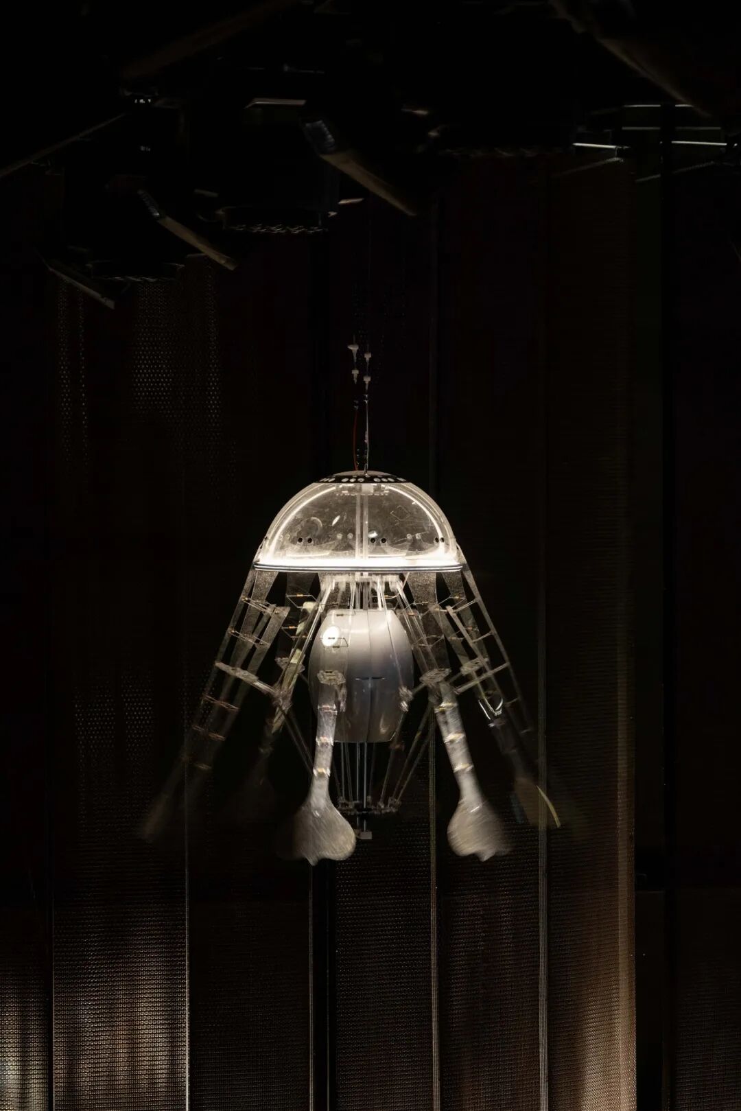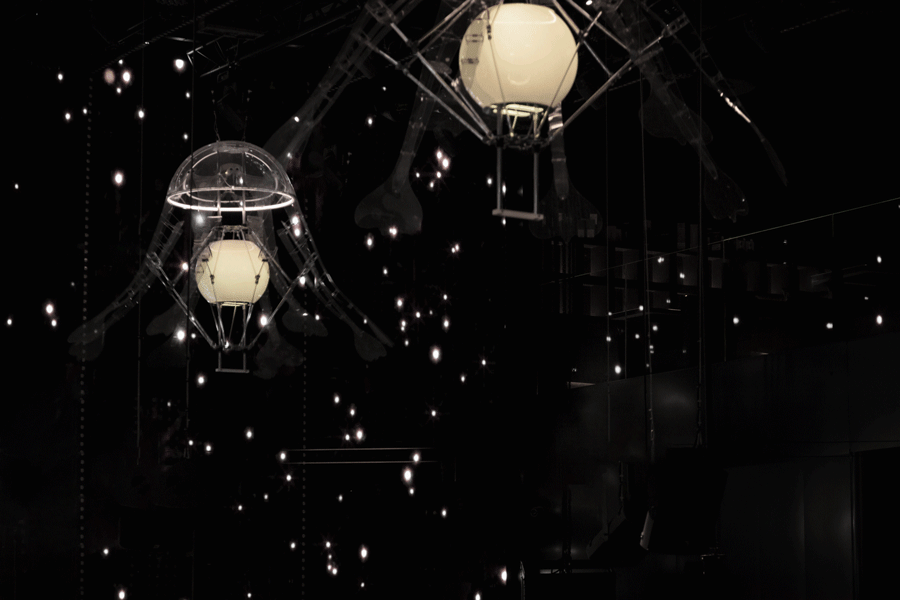 从十米高缓降的水母呼吸灯犹如人们在当下思考着新与旧、驻守与冲破、慵懒与探知的碰撞糅合。