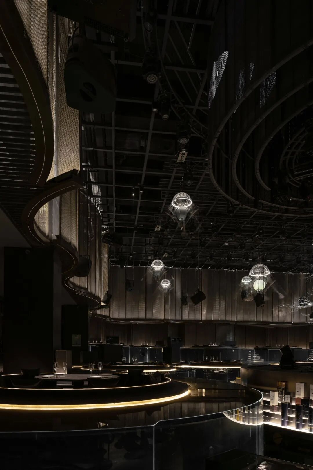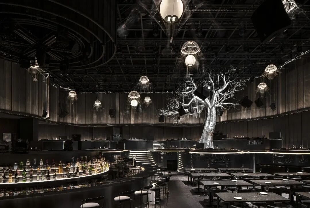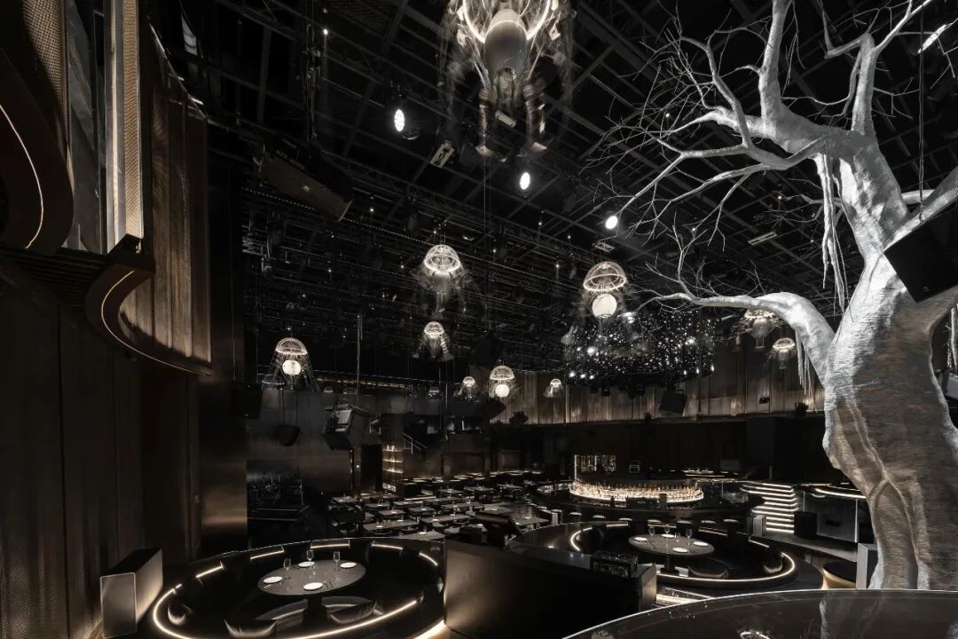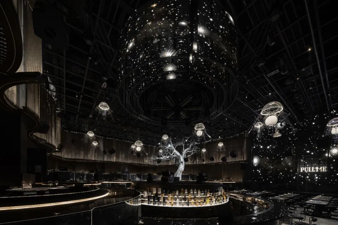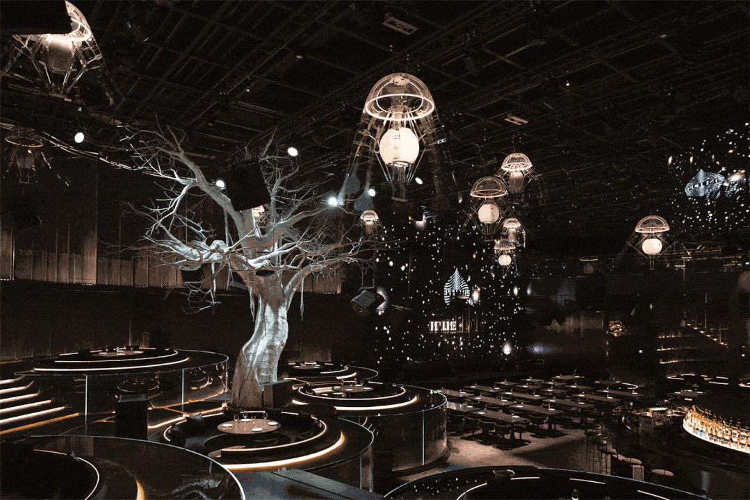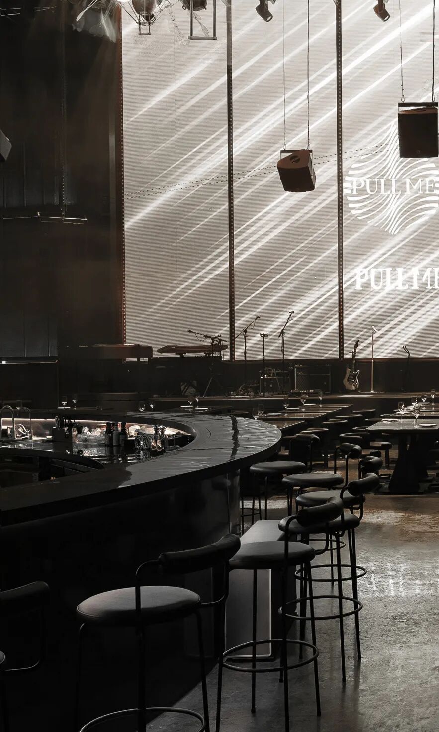 圆环升降屏的舞台与出品吧台相衔接,演出的同时拉近客人-出品-表演三者间的距离,长条舞台的背景满铺LED屏,在保证音乐场域均衡自洽的同时,随着韵律和水母呼吸灯的升降,营造动态更迭的剧幕与互动。