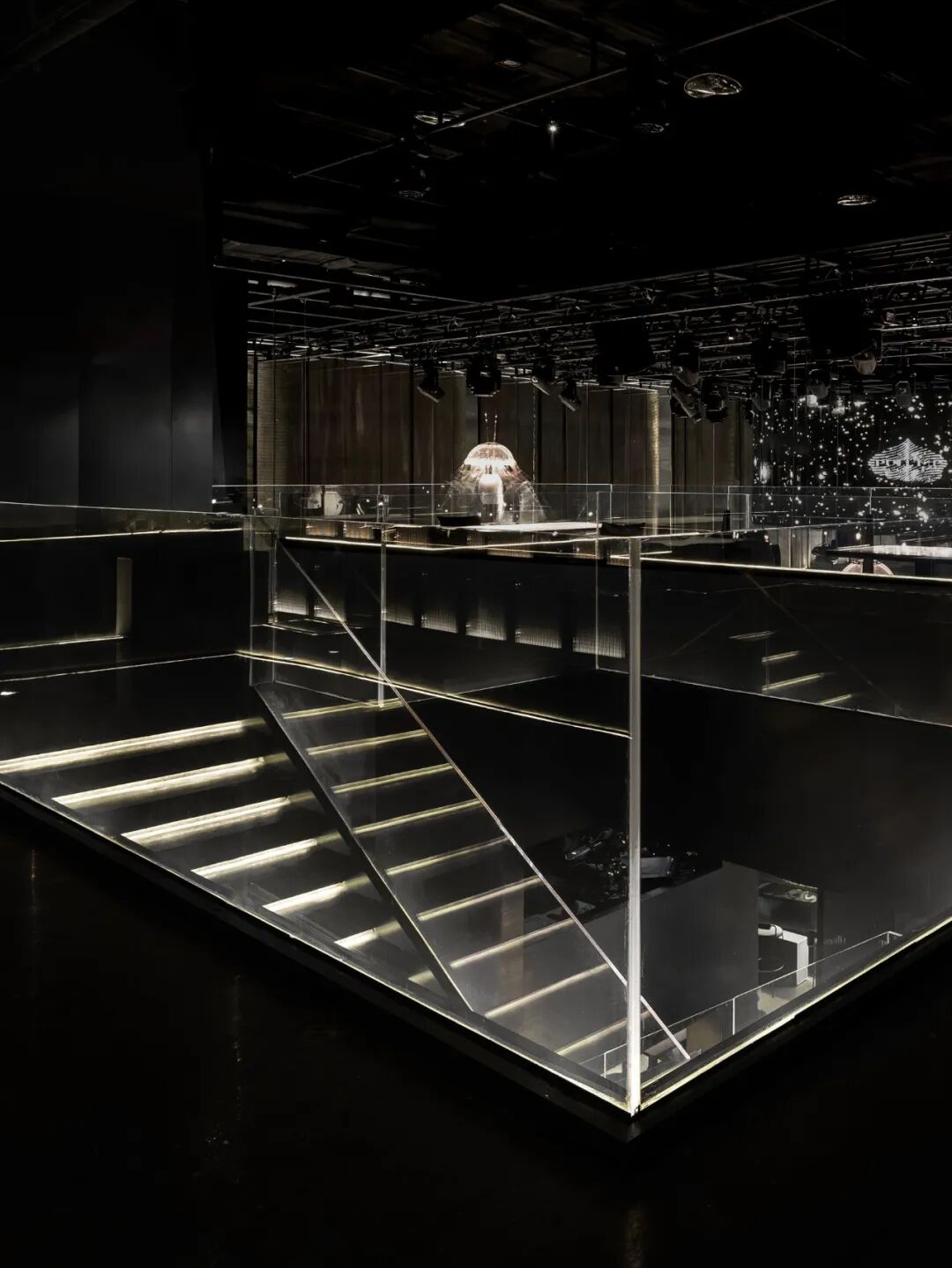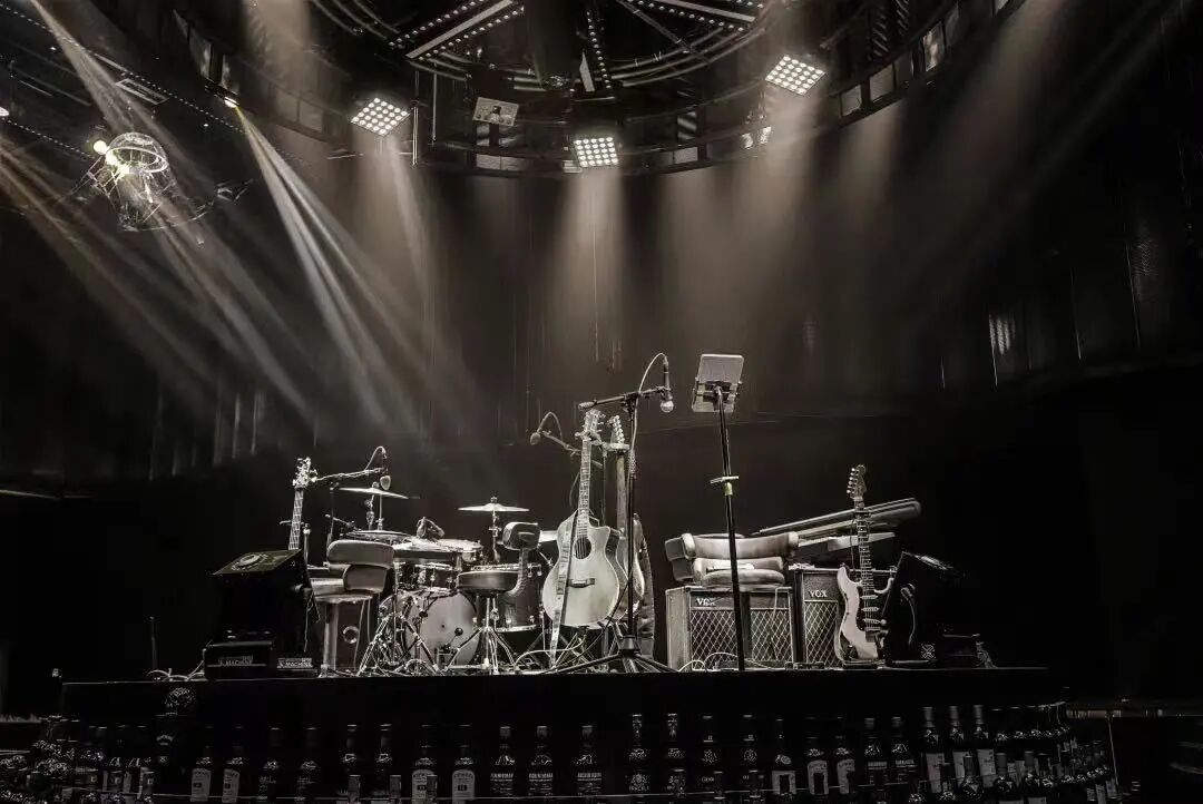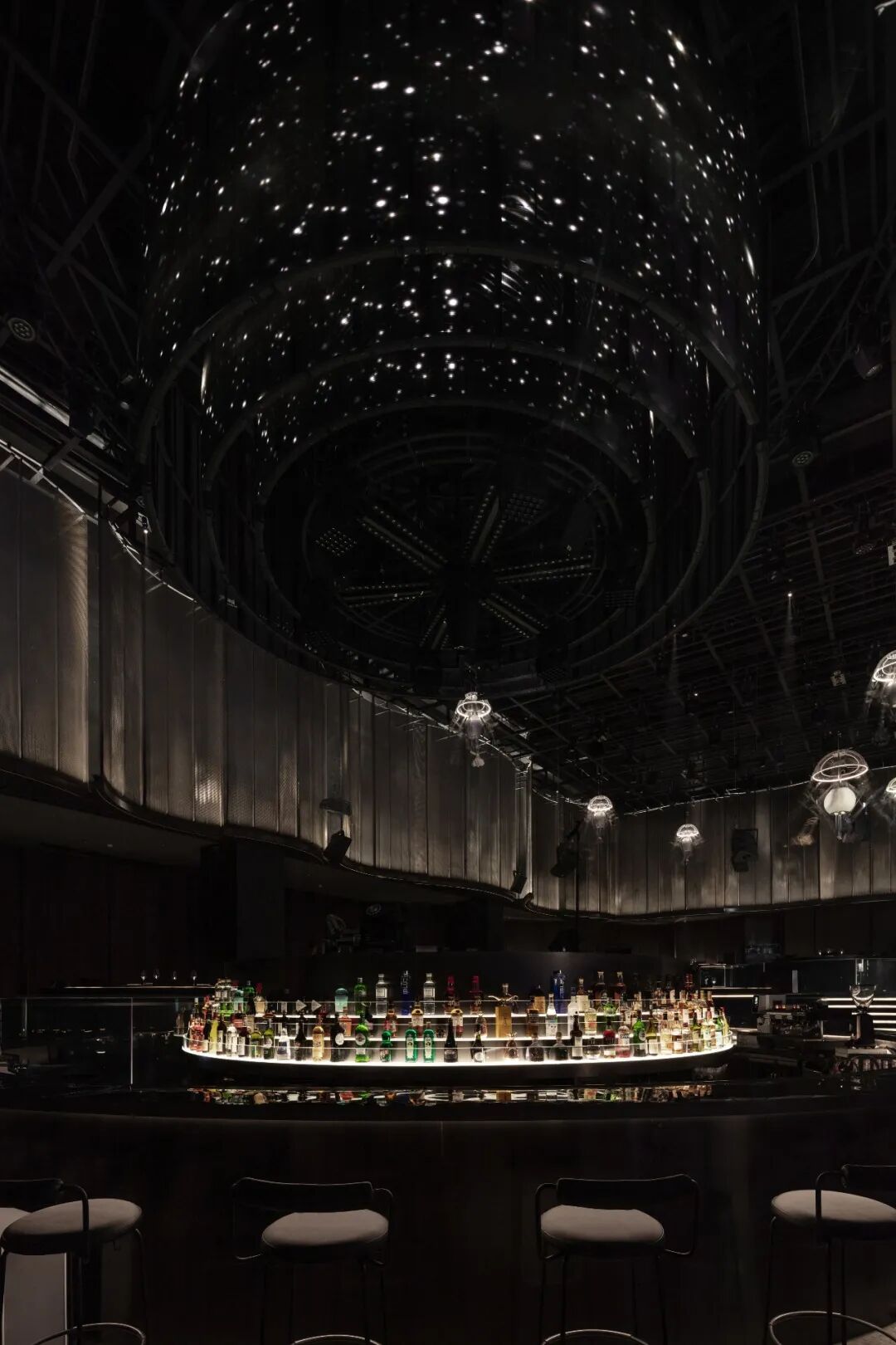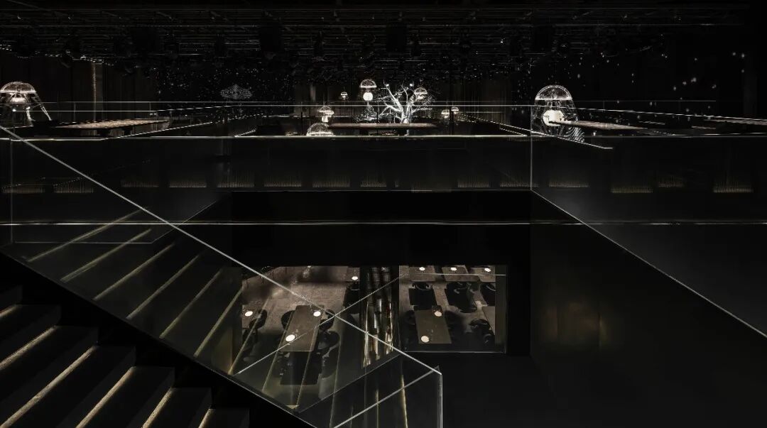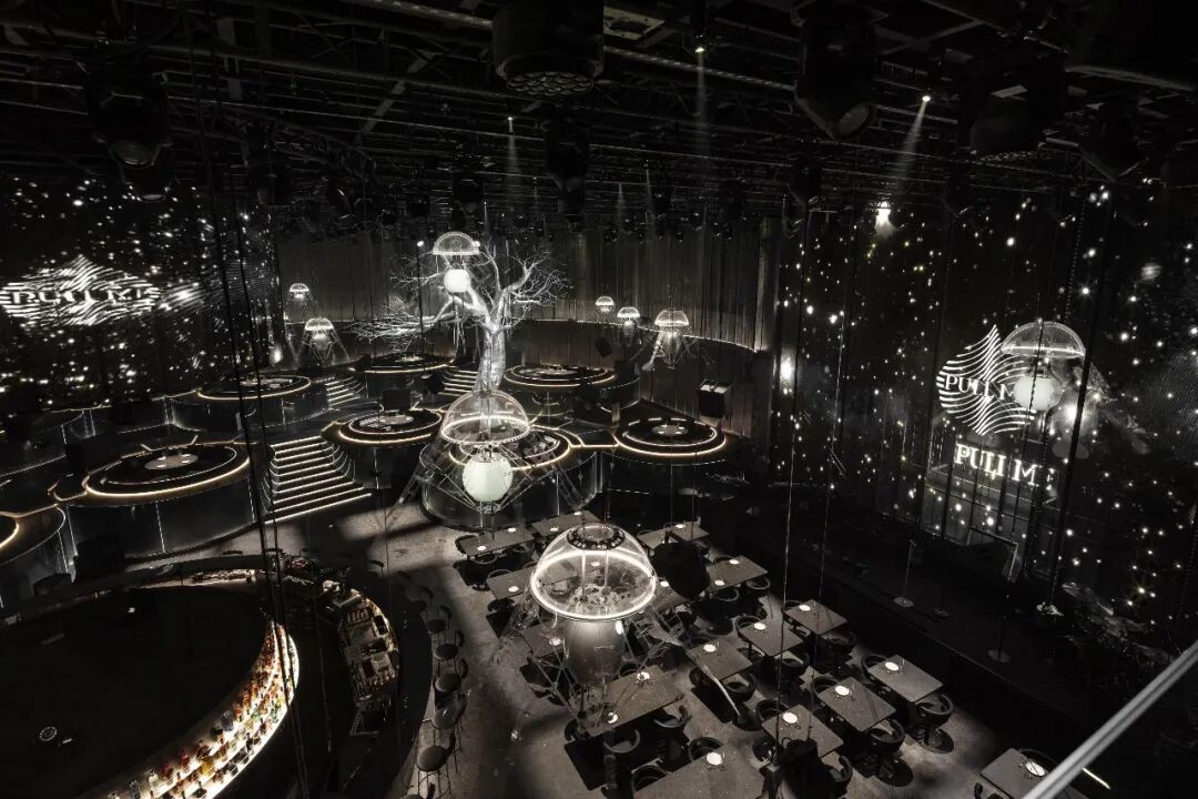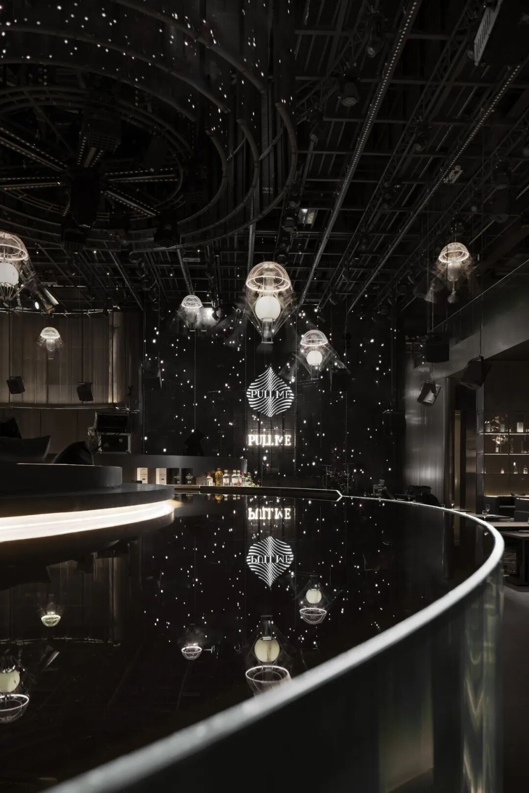 圆环升降屏的舞台与出品吧台相衔接,演出的同时拉近客人-出品-表演三者间的距离,长条舞台的背景满铺LED屏,在保证音乐场域均衡自洽的同时,随着韵律和水母呼吸灯的升降,营造动态更迭的剧幕与互动。