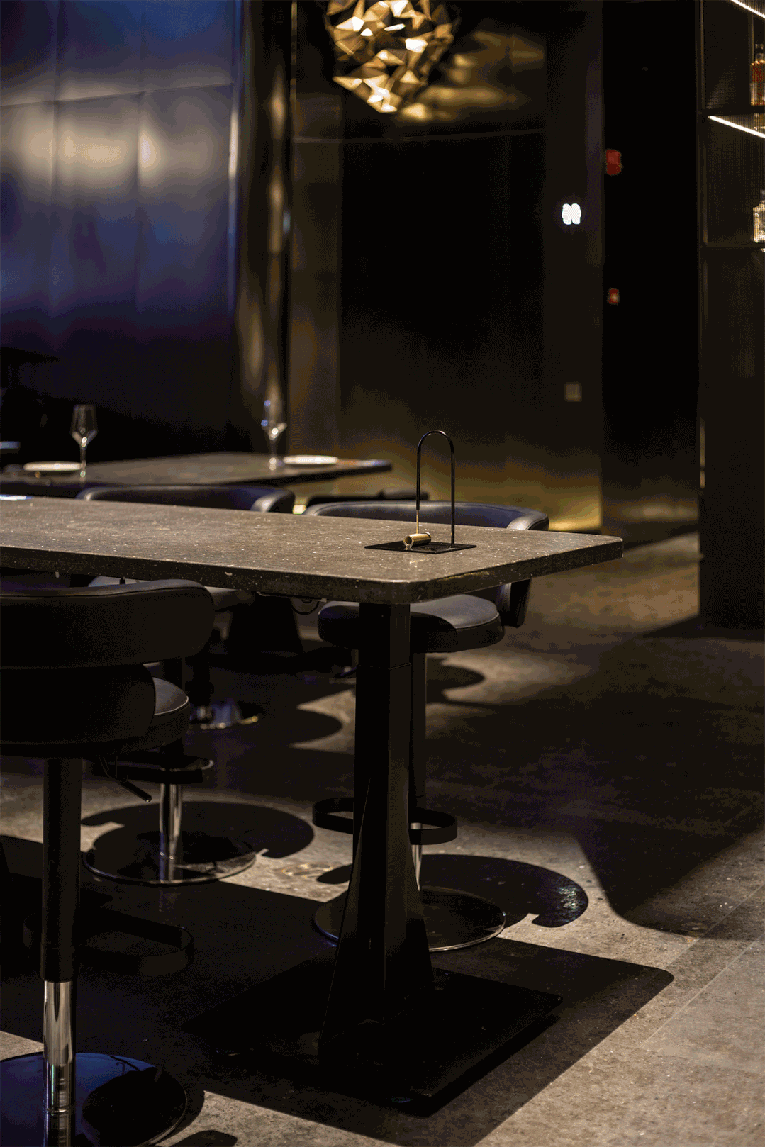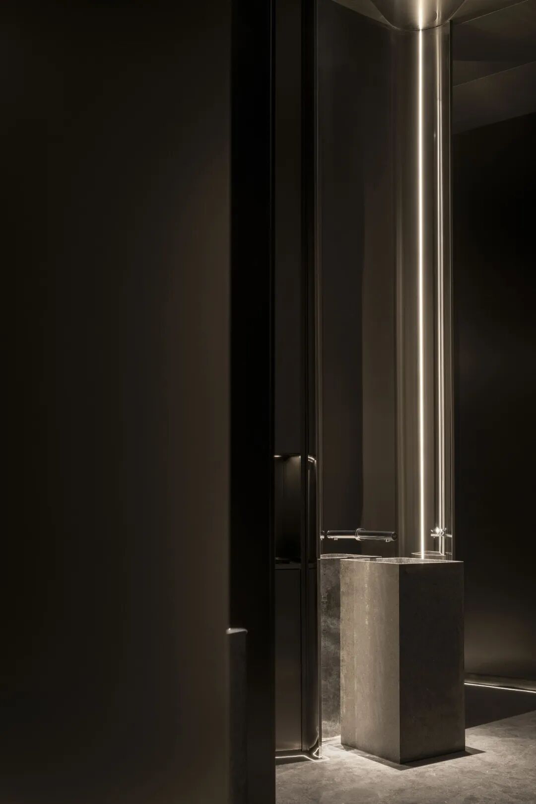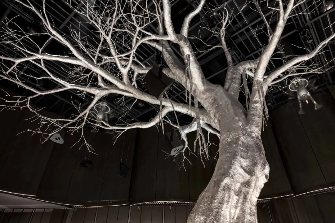 空间整体采用黑金色调,灰黑色石材与金属材质,以硬朗的物感形成简致大气的建筑格调,以柔软的灯光与金属装置“浮生树”的亮银色融合冷硬的气调。