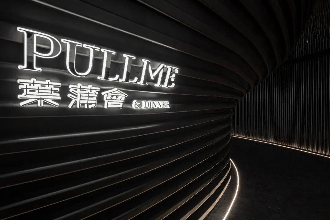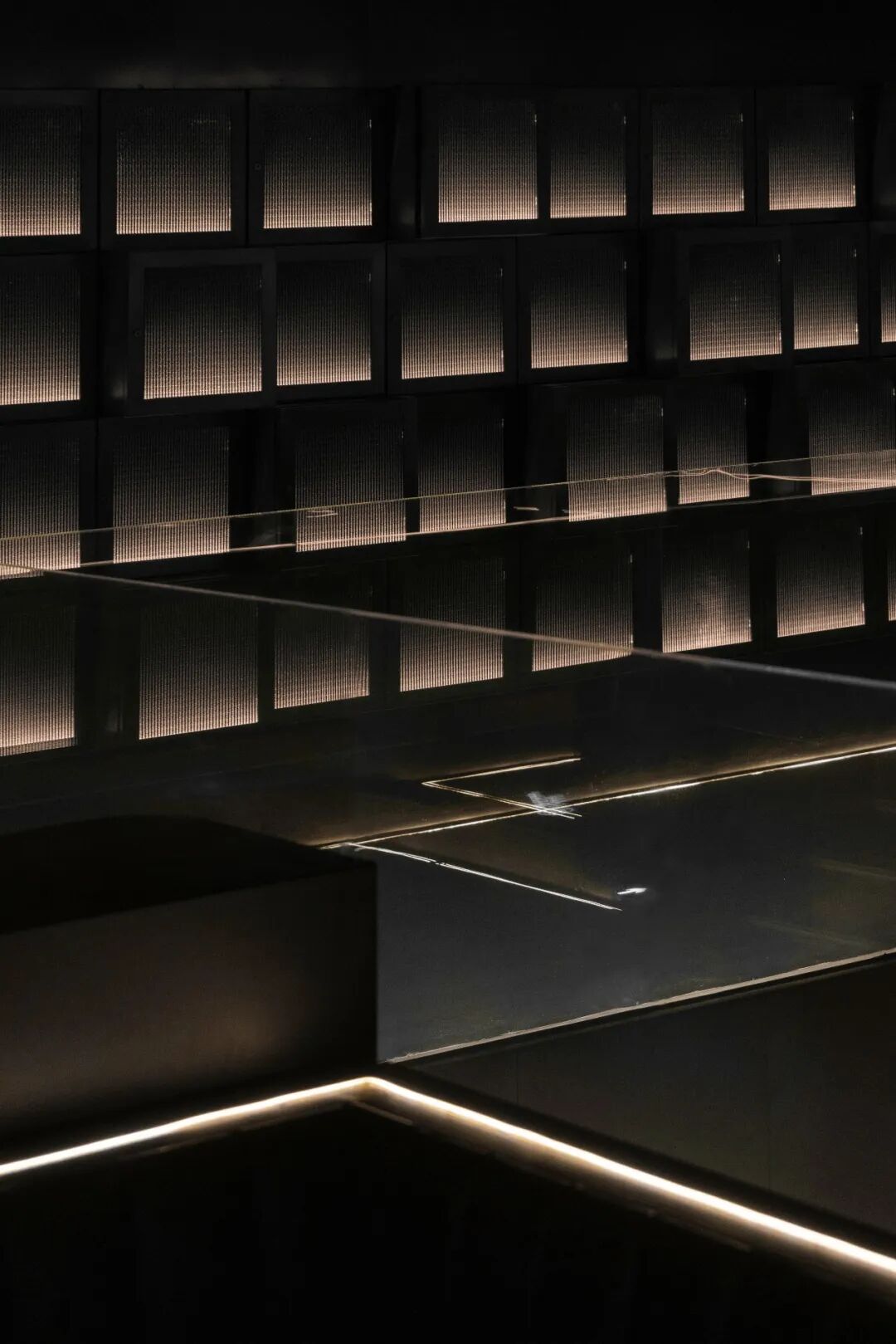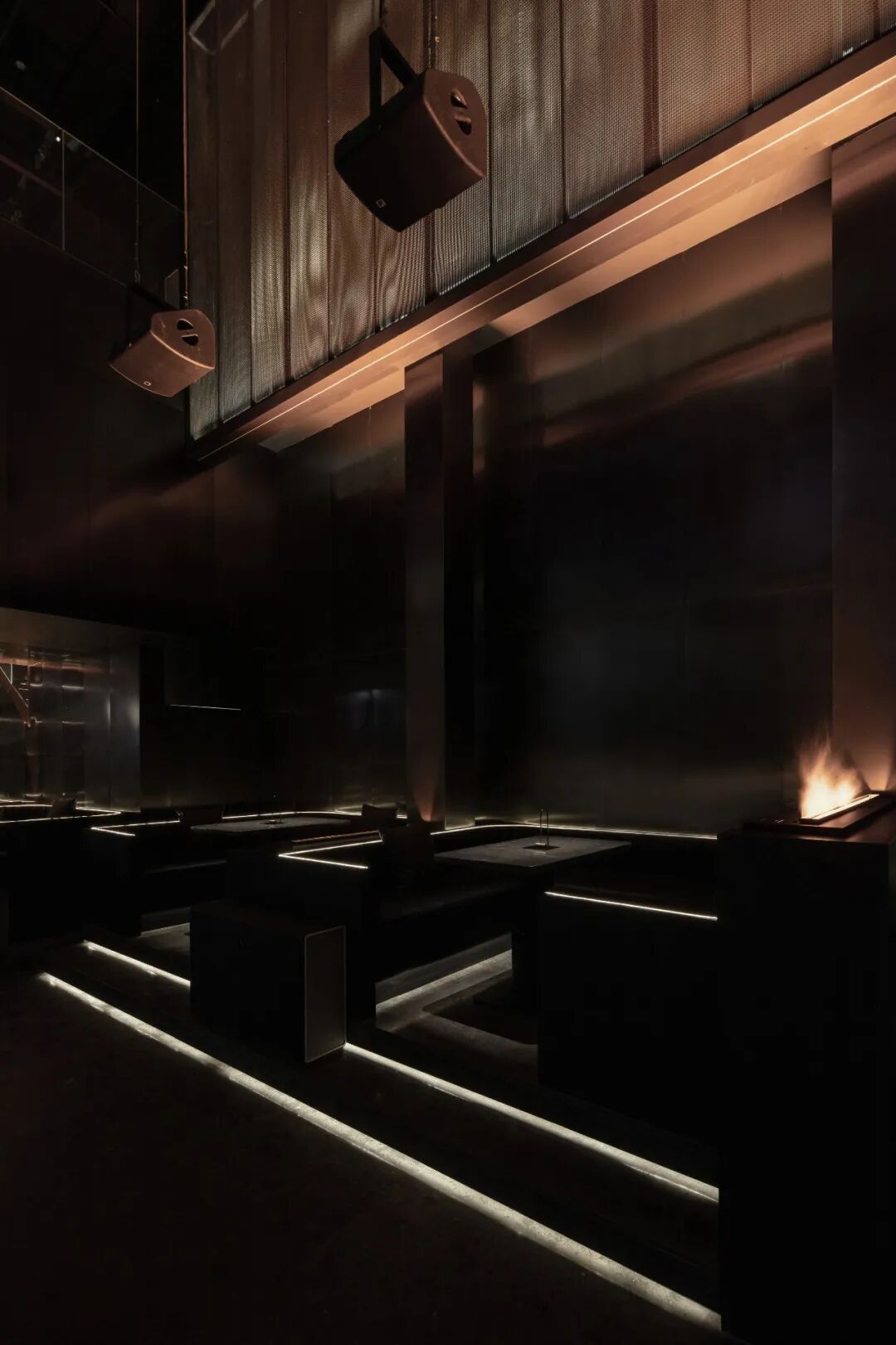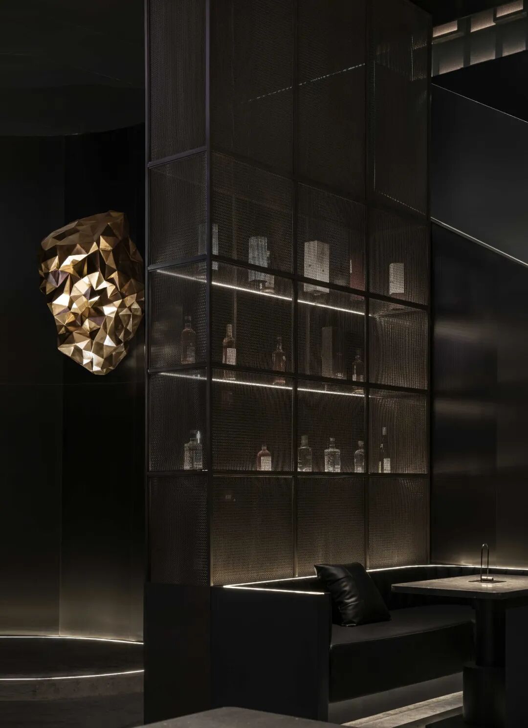 水域底座选择暗金色的金属材质。在灯带的反衬下与墙面微微起伏的金属网以波浪状的形式将整体空间围合起来,形成柔韧的金属“纽带”。