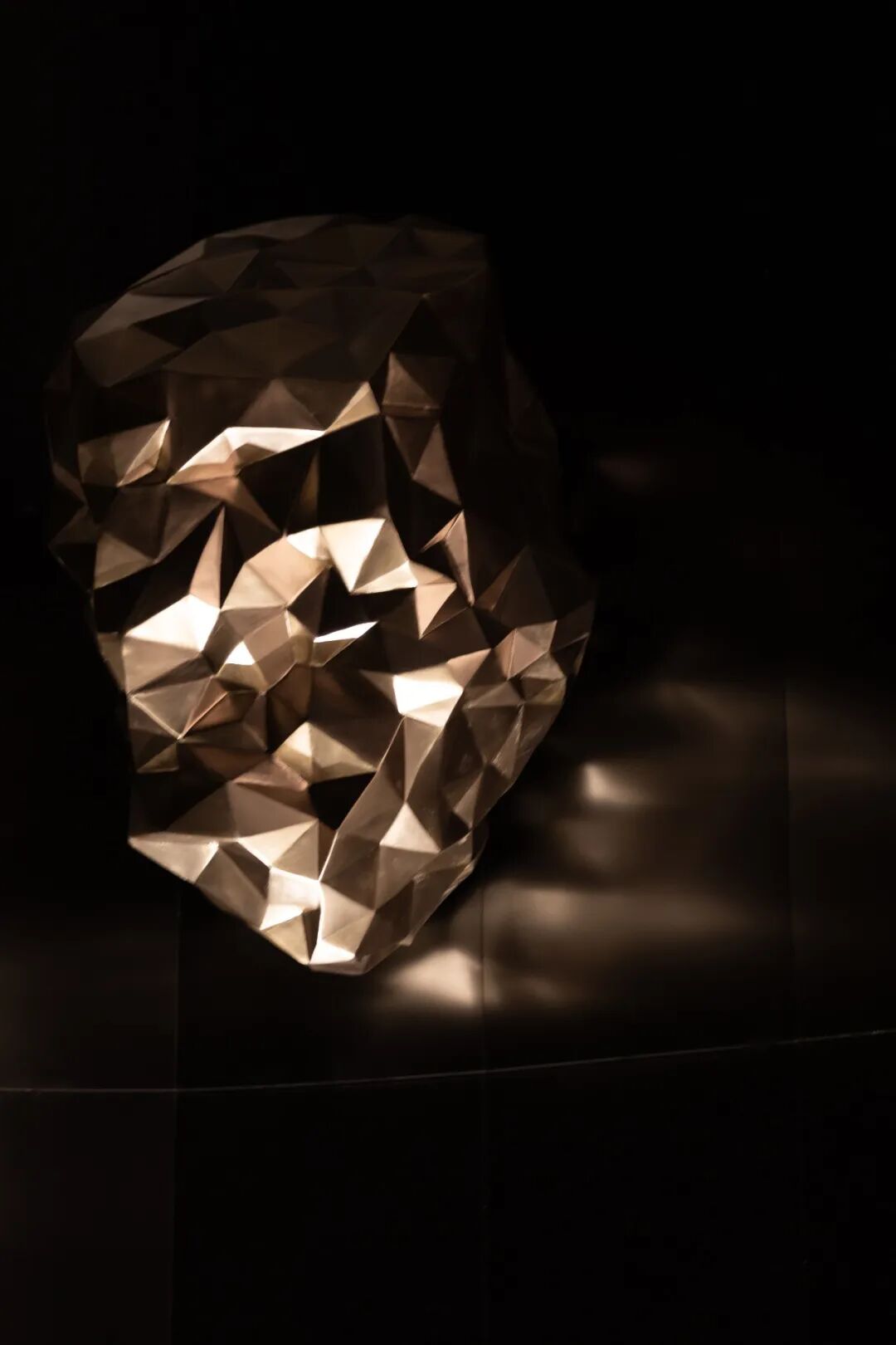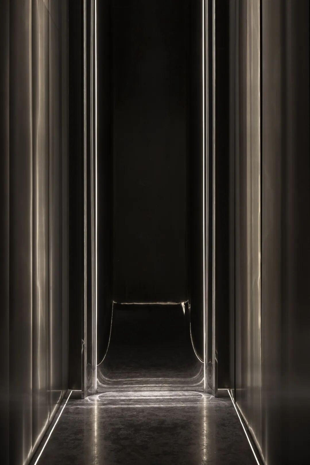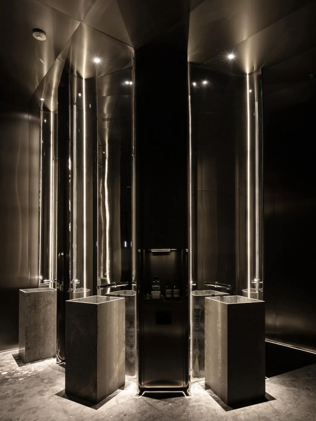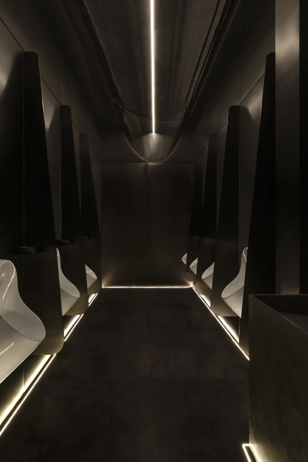 水域底座选择暗金色的金属材质。在灯带的反衬下与墙面微微起伏的金属网以波浪状的形式将整体空间围合起来,形成柔韧的金属“纽带”。