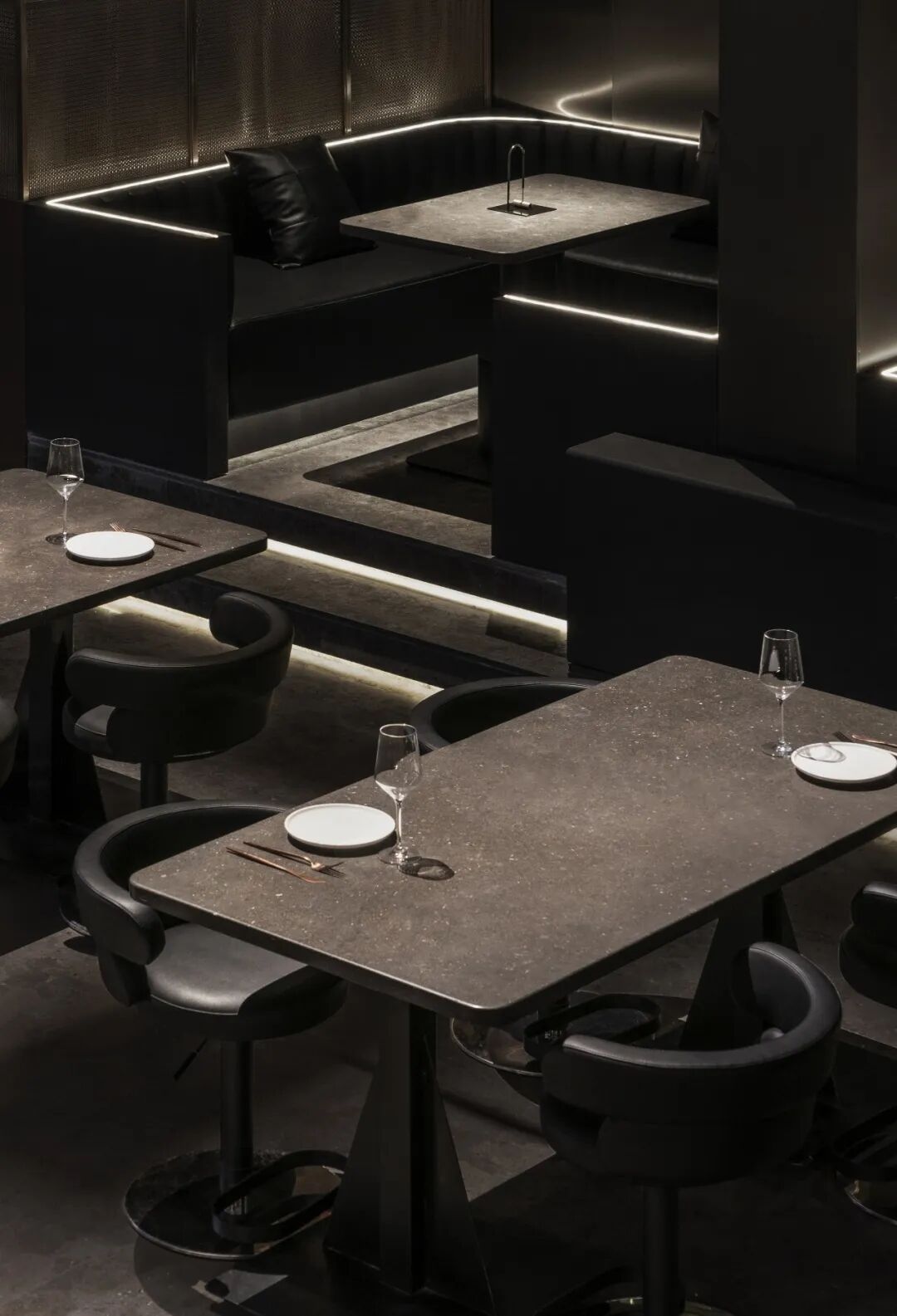 空间的中心是环形高吧台,吧台顶上为LED三层圆环升降屏。右侧的半封闭沙发区通过建筑构成延伸至二楼夹层,与夹层的半围合餐区呼应,这一构成既阻断进入空间的视觉穿透到底,又引导客人夹层客座的选择性。