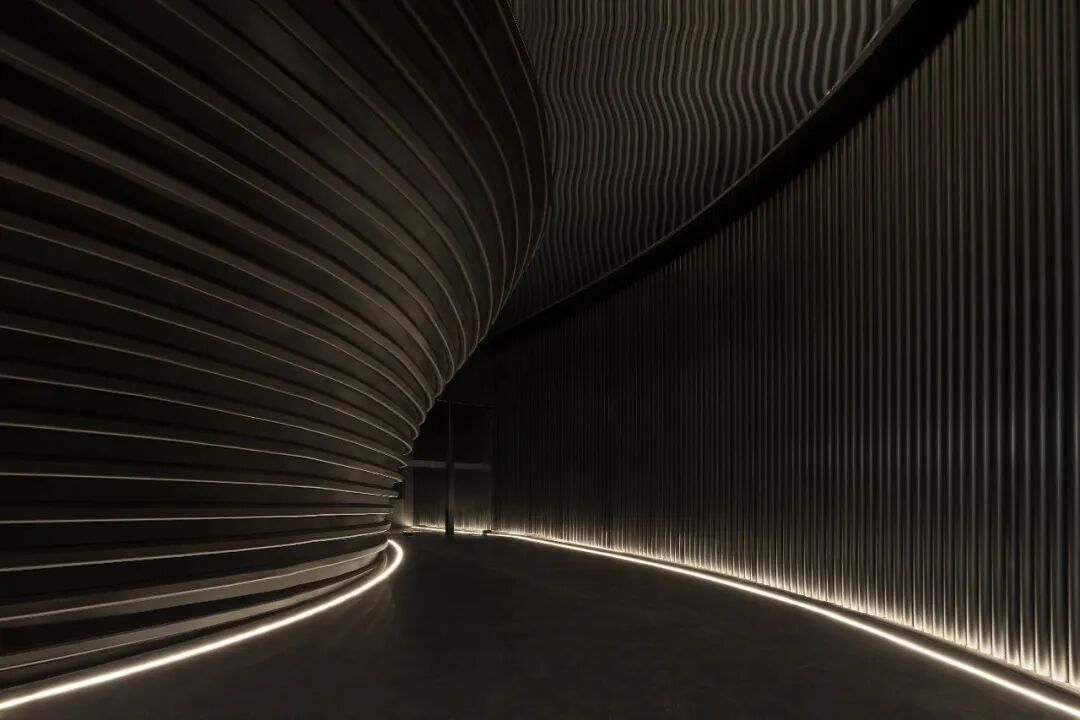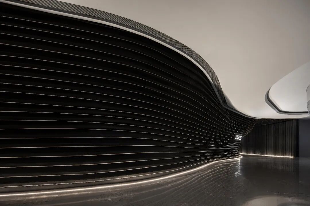 入口空间是条狭长的曲径长廊。设计师运用雕塑手法将金属管融合于墙面,采用蜿蜒流畅的弧度设计出强烈的线性延伸感,像连绵起伏的波浪,让人感受到刚柔并济、力求至上的探究之意。