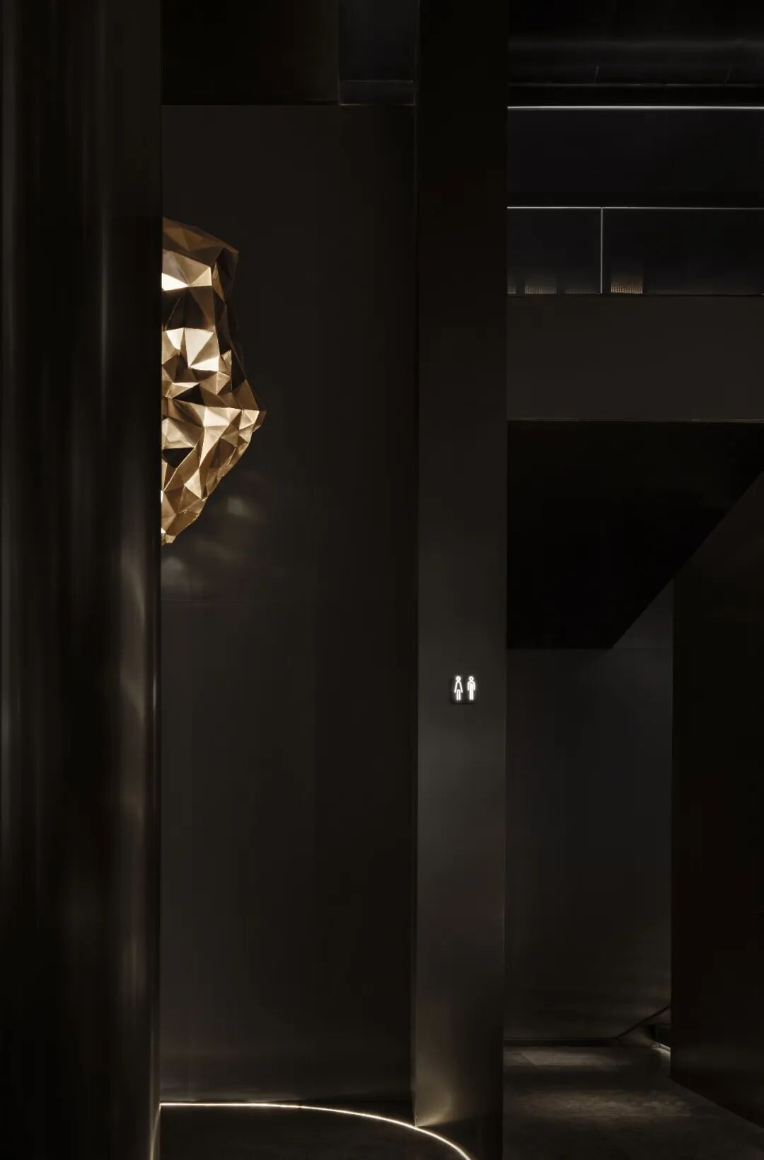 随着地面柔和的灯带,逐步将视野从主入口的3米高延伸至室内超10米的空间,如同打开一道探险之门。