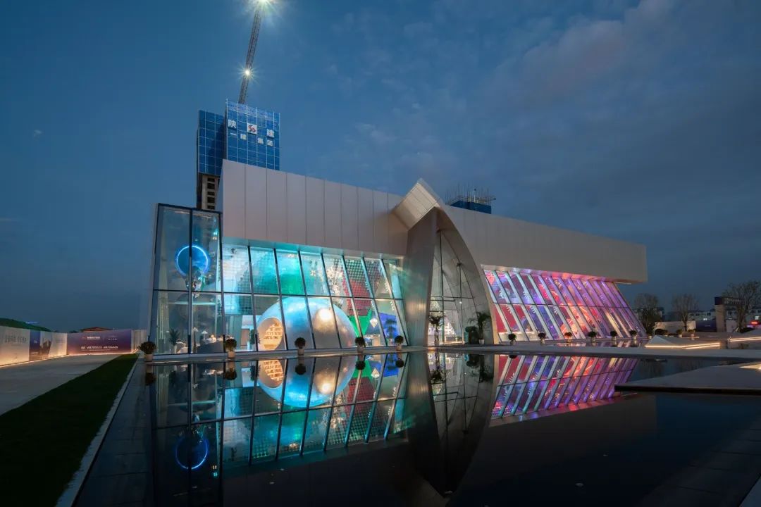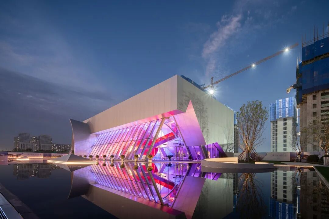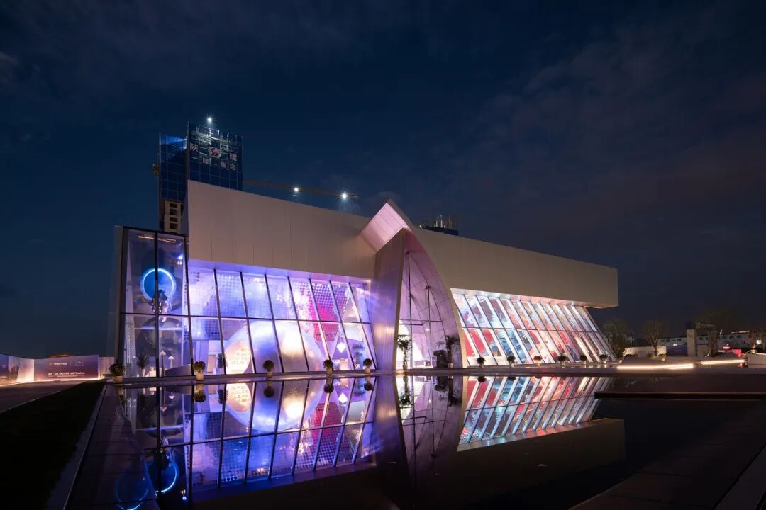 在这个作品中,通过对建筑与空间的理解,我们认为这是一个需要将环境照明与室内照明结合的作品,气氛的烘托主要由景观照明来完成。建筑的照明主要是要依靠室内的内透光来表达。建筑师通过不同的几何形体的衔接与穿插,将不同区域的功能需要实现出来。空间形式的现代感,需要有非凡意义的光。这次,我们依然选择了色彩来进行演绎。