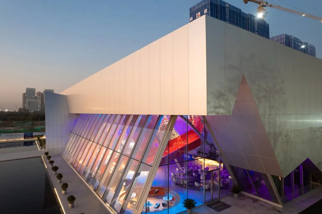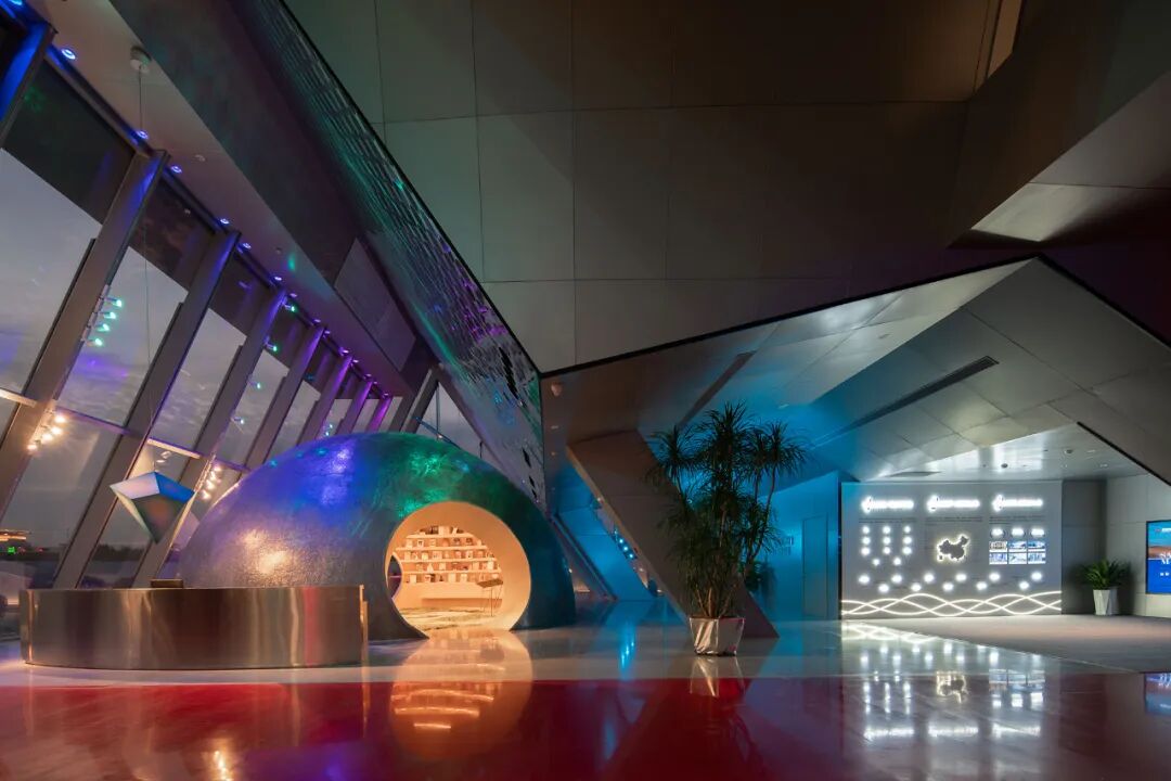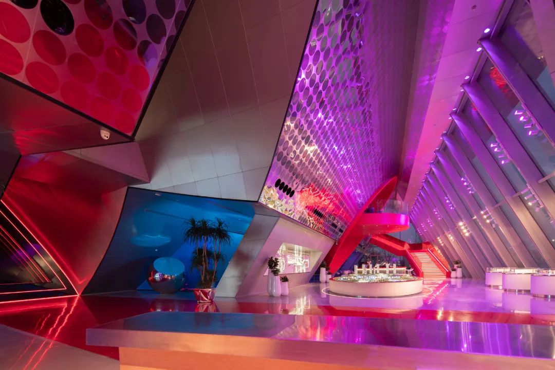 色彩的内透光在室内空间充分发挥,建筑的轮廓也自然的表达出来,建筑立面以“留白”的手法呈现。室内我们充分利用建筑幕墙的内框,将传统空间中的灯具由天花转移至立面。突破传统的布灯形式,才匹配突破传统的空间形式。