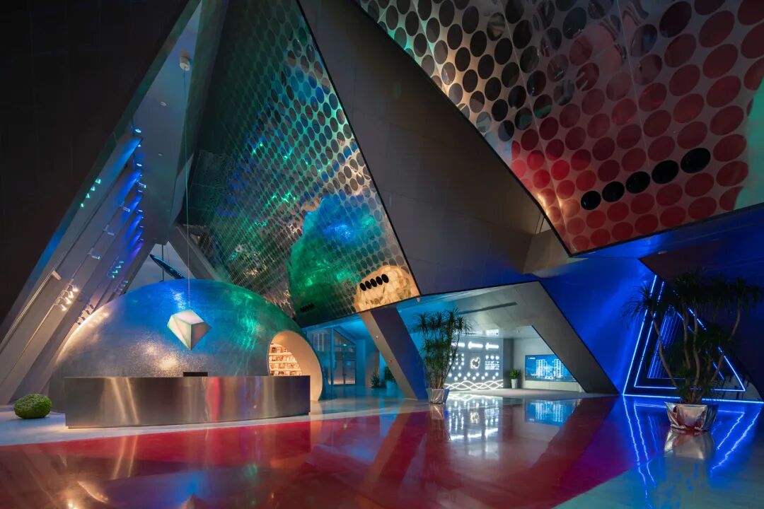 The interior color light is given full play in the indoor space, through which the outline of the building is naturally presented. The facade of the building is presented by the tactics of “leaving blank”. For interior design, we make full use of the inner frame of the building’s curtain wall, and move the traditional ceiling fixtures to the facade. Only by breaking through the traditional lighting can it match the nontraditional space design.