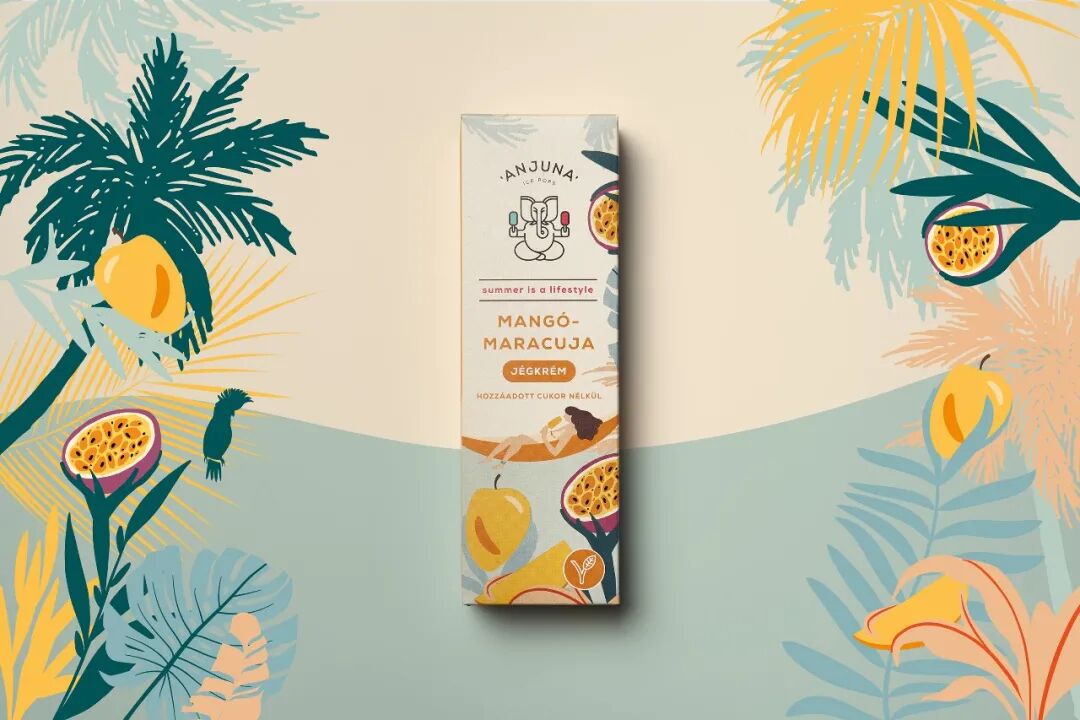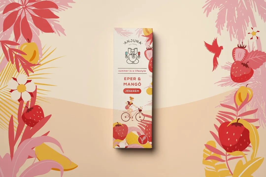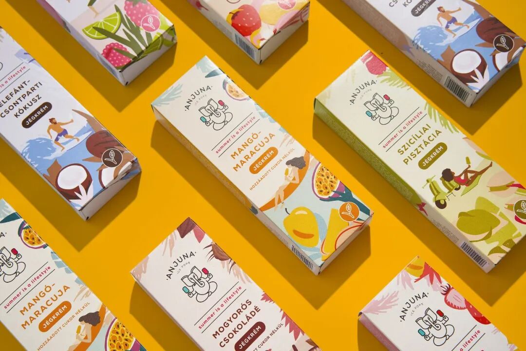 目前有两种类型的盒子,一种是用于单个产品的盒子,还有一种更大的盒子可以容纳 15 个冰棒。至于颜色,我们选择了与冰棒相似的色调,并用其他更大胆的颜色突出它们,让它看起来清新可口。当然,用于包装的材料是可生物降解的,因为Anjuna努力保护我们宝贵的地球。