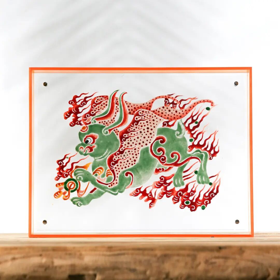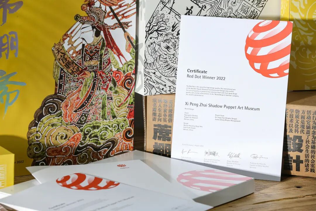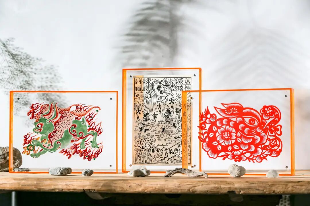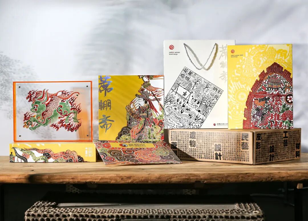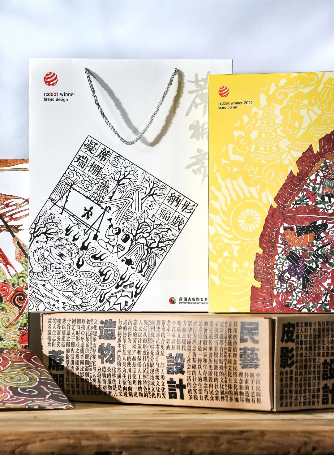 蓆棚斋:在2022年初,我们有幸参加了红点设计博物馆“有虎同祥——壬寅虎文化主题设计展”,在壬寅虎年我们做了关于虎的皮影文创,《如虎添翼》和《虎气新春》,在西安市平面设计协会主席刘君涛老师的支持下,这两件作品有幸得以参与其中。在此次展览中,民兿单元作为开场的第一部分,包含了皮影、剪纸、布艺、面花、年画等,这些都是陕西地区非常有代表性的传统手工艺。也充分体现了设计协会在刘老师的组织引领下对本土文化资源的关注与整合,也希望传统民兿能与当代设计碰撞、融合。此次展览除了民兿单元以外,还有字体设计、海报设计、文创设计等内容,都是围绕“虎文化”主题而展开。对于我们自身而言,无论是艺术创作方面,或是文创产品设计层面都有很大的启发,尤其是系统性、整体性方面。对于皮影的视觉设计开发而言,皮影制作只是其中一部分,还应该有一套完整的视觉传达体系。通过此次展览,我们也认识到传统手工艺与当代艺术设计之间互通融合的可能性。我们便对我们现有的材料做了相应的调整,然后经过校色、打样、拍摄等工作后就投送了红点。
