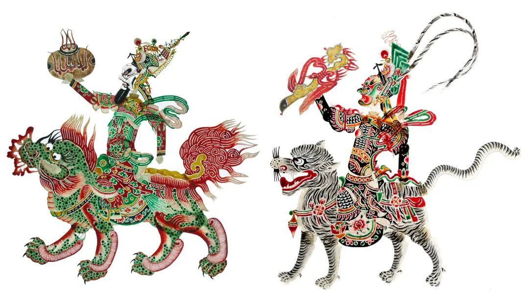 创作思路:该套作品以陕西华县皮影戏中的“敬神戏”为基础,选取神将天兵的造型,手执法器,跨骑瑞兽。“敬神戏”在民俗语境中具有祈福驱邪的象征寓意,在此借以表达“万众一心,共克疫情”的祝愿。