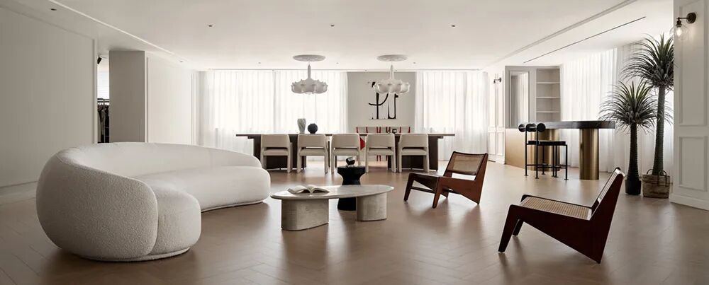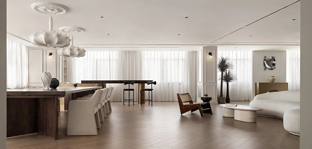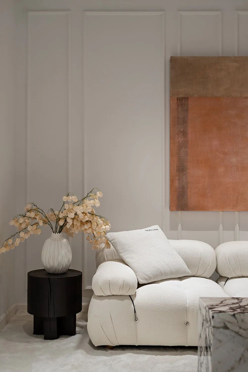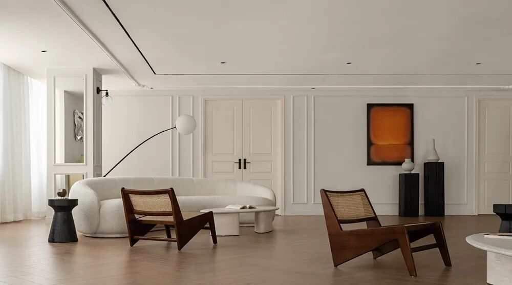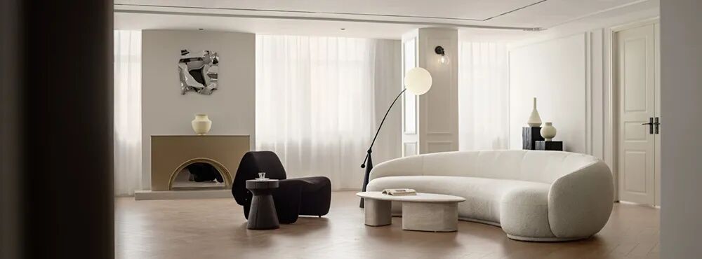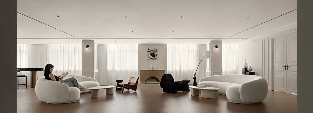 在投入有限的情况下,其实是在偏重中找平衡。空间对软装要求比较高。首先在大空间用刷白和线条来减少费用,后期综合大件家具来补充氛围。会客厅的大沙发很美,等了1~2个月,我们认为值得。其次是在重点区域如前厅做了一些材料和手法的表现,像做工复杂的顶灯,有质感呈现高级。
