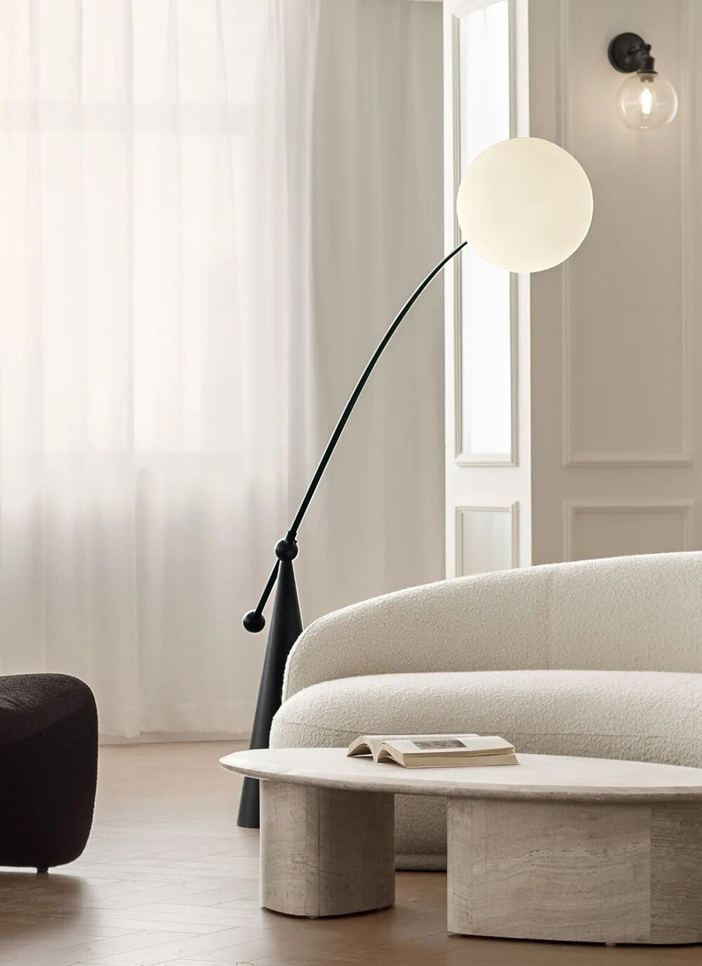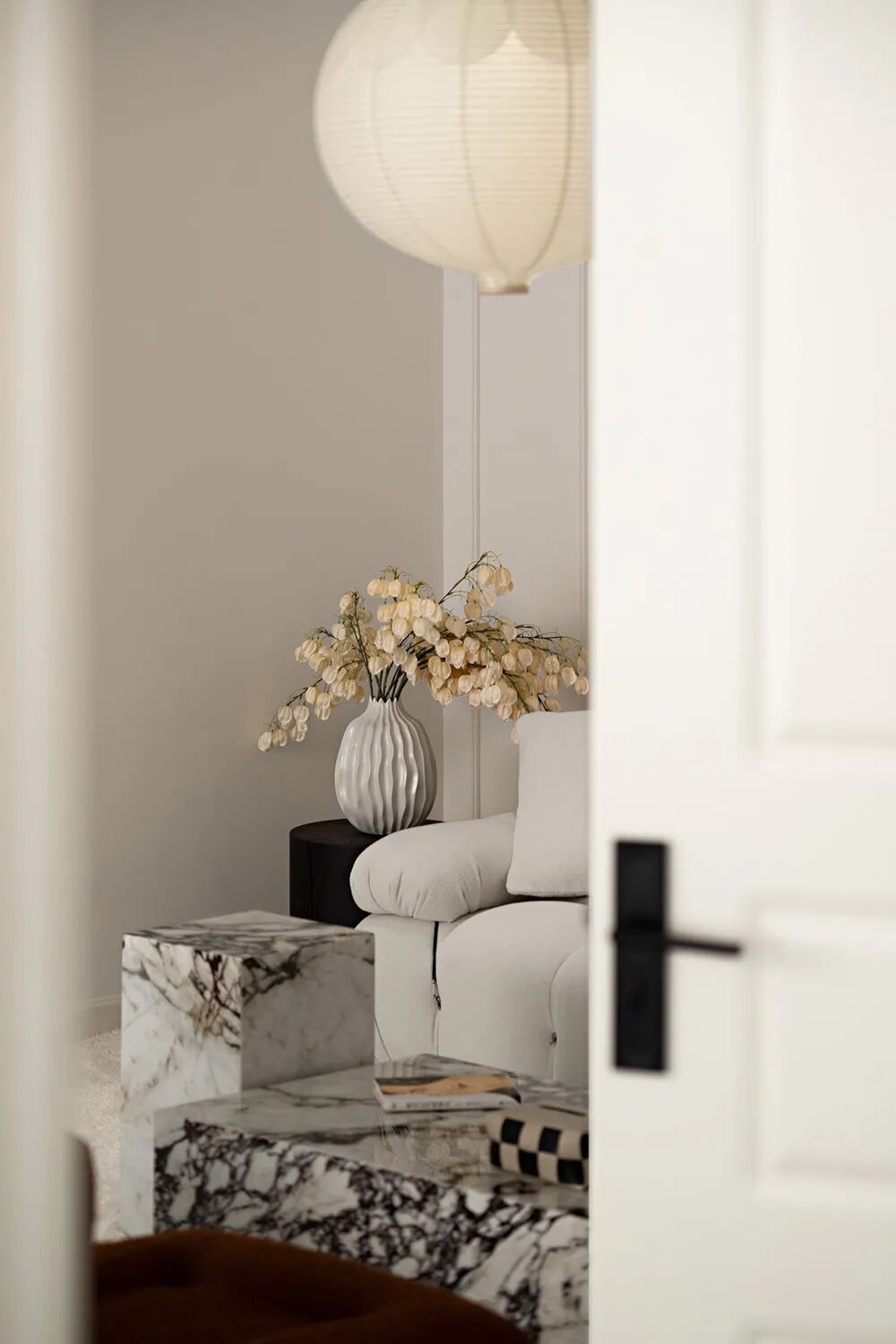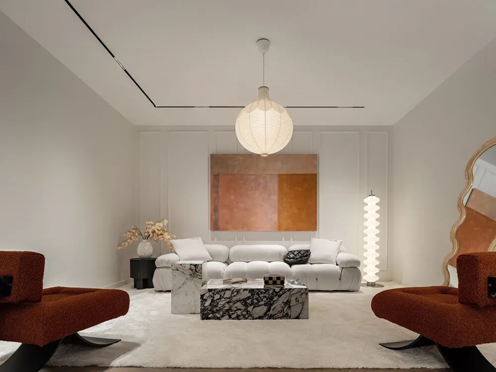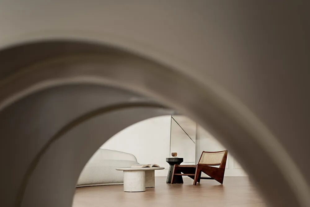 在投入有限的情况下,其实是在偏重中找平衡。空间对软装要求比较高。首先在大空间用刷白和线条来减少费用,后期综合大件家具来补充氛围。会客厅的大沙发很美,等了1~2个月,我们认为值得。其次是在重点区域如前厅做了一些材料和手法的表现,像做工复杂的顶灯,有质感呈现高级。