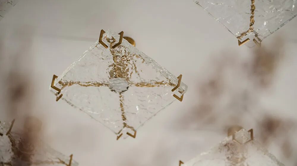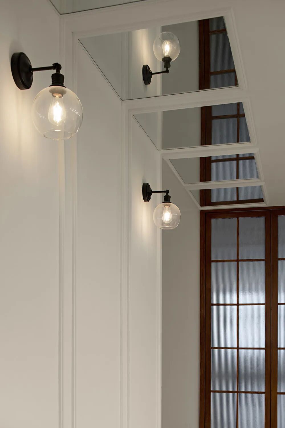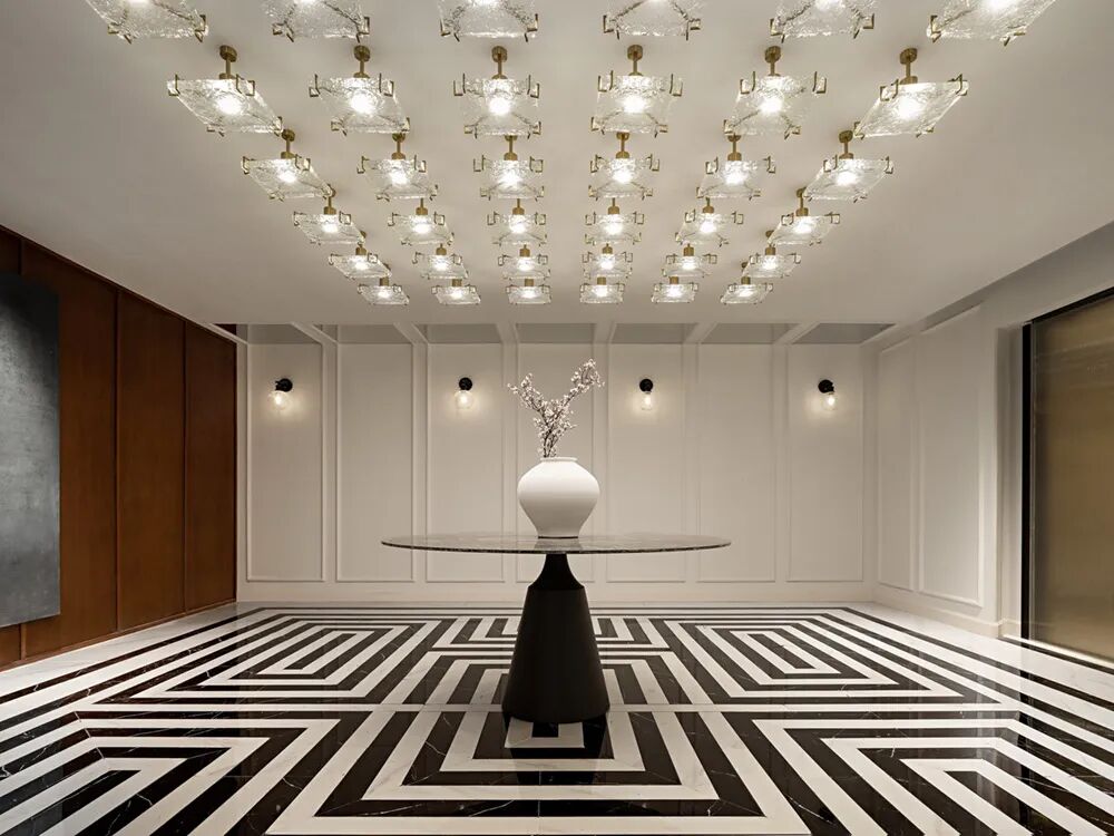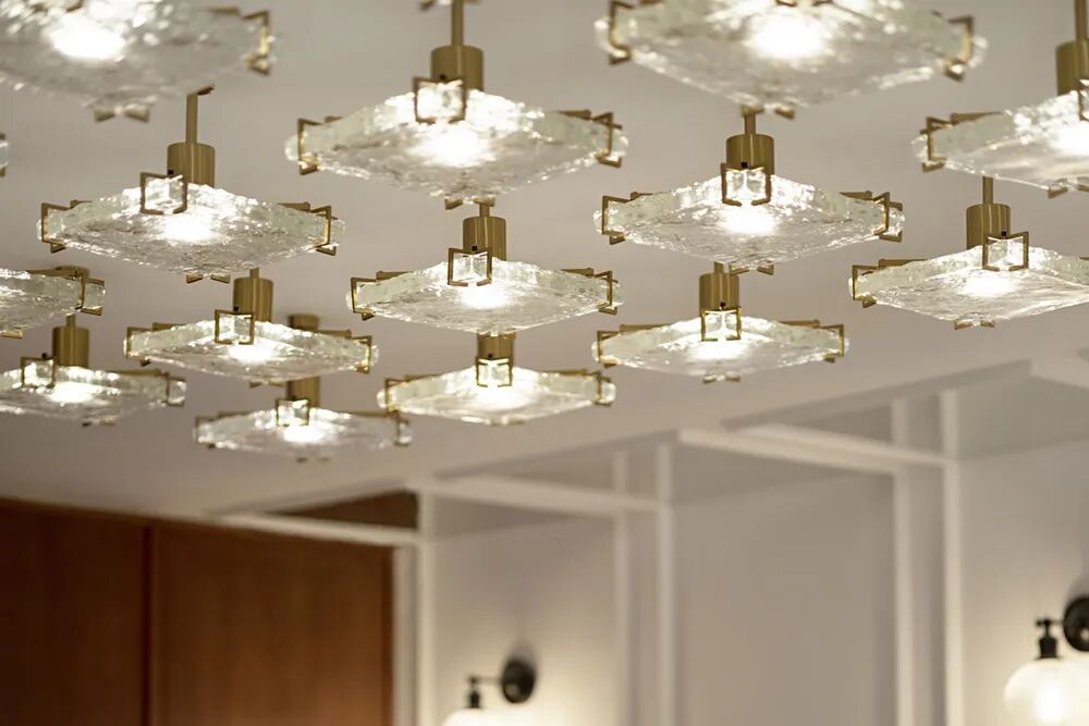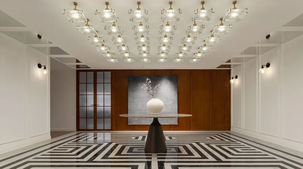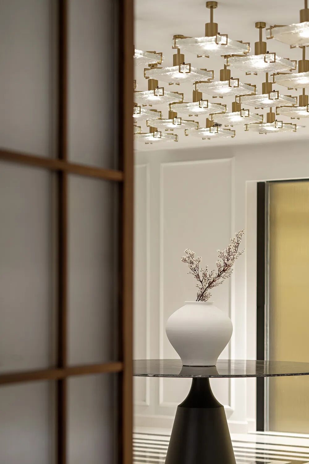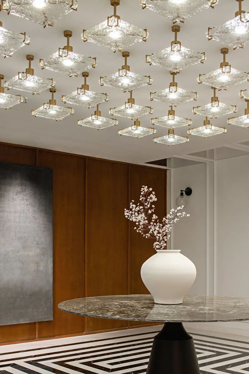 层高仅2.4米,为了避免压抑和单调,借“阵列之美”形成韵律和力量。36个复古水晶手工灯紧贴大平顶通透铺开,与强调精致生活的线性墙面与壁灯,保持着若即若离的关系。现代与复古的结合,小细节体现优雅。