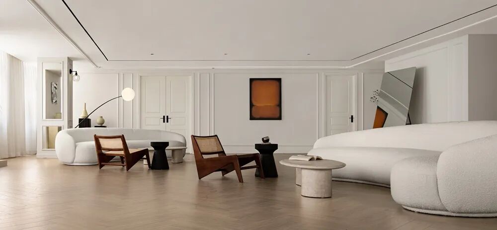 在这里,设计强调会客如会友的轻松交流氛围。延续前厅浓重底色,大面积白墙束以精致的线条。选择素白的大沙发、慵懒的单椅对谈,视线余光位置设法式浪漫的金色壁炉和亮面艺术品去补充氛围。