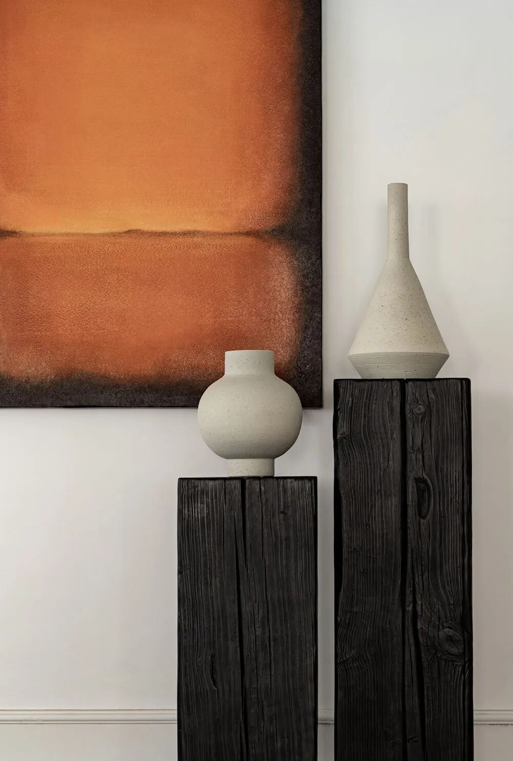 正前方是一面包裹着日月星辰的当代艺术墙,与通往内部空间的大门视觉归一。抓人眼球的爱马仕橙木饰面和意境画,与醒目的白色陶罐、黑白回字型地面融为一体,向20世纪的法国生活致敬。