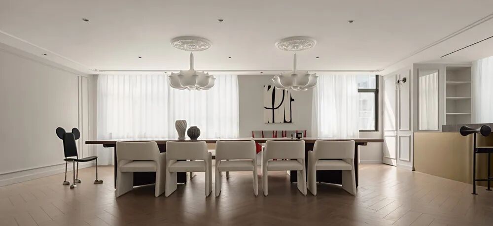 会议区与传统设计方式不同,会更加偏重“美”在空间给人的印象。设计形式以略显刻意的法式宴会大长桌为中心,复古味十足。两盏造型如花般绽放的艺术丝绸吊灯把整个氛围拉满,这里俨然就是日常出大片的拍照地。