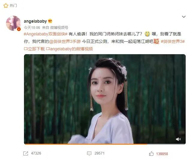 游戏之外,《剑侠世界3》也安排了一系列紧凑的营销节点,和代言人进行了紧密互动。8月5日和6日,官方相继在公众号、微博等平台发布悬念海报进行预热,吸引网友的注意力,并在8月8日正式官宣,相关内容也获得Angelababy本人转发,影响范围进一步扩大。