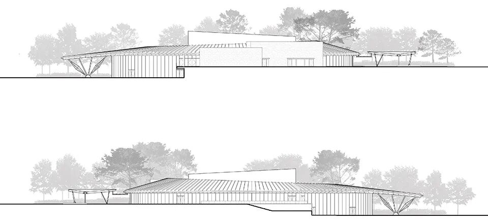 建筑空间构成是西塘古镇空间脉络的传承,围绕建筑一圈弧面大屋顶从建构到空间的灵感系于西塘之烟雨长廊,长达三米的挑檐附抱周圈水面,是对烟雨长廊揽水入怀的现代演绎。于展廊中漫步,穿越江南百年烟雨。建筑整体以一叶扁舟形象呈现,通过南侧十里港水面的放大引入,如航船破水起航,传承嘉兴红船文化。 概况项目概览 © 庄子涵