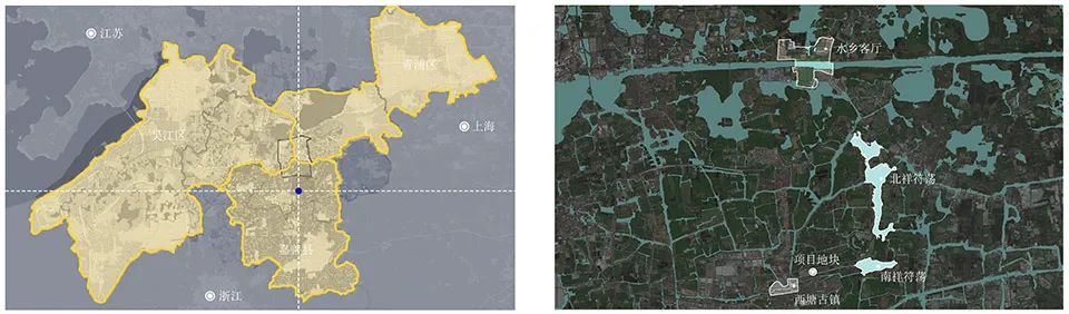 本项目选址于嘉善县西塘镇中兴路、贞观路交叉口东南。基地南侧的十里港自然水系西接千年古镇西塘,东达南北祥符荡后联通长三角原点——水乡客厅。紧扣“一体化”“高质量”的发展主题,项目定位强调打造具有江南特色,国际先进的绿色建筑标杆。