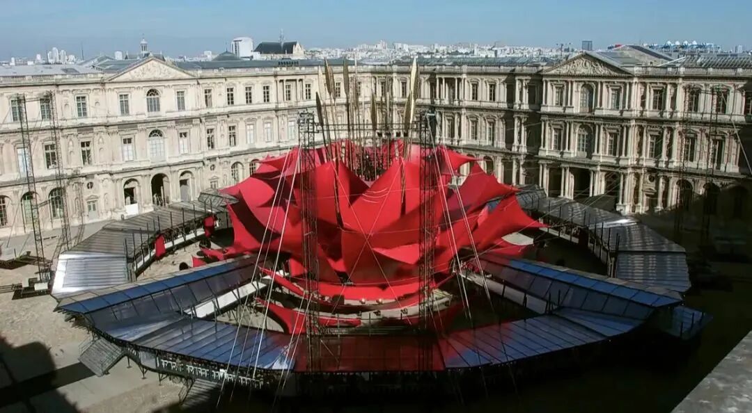 布景的中心是一朵鲜艳的红色“怪物花”,花蕊呈金色,引人注目地升上巴黎的天空。这朵巨大的花朵像宇宙飞船一般,灵感来自公园和马戏团错综复杂的美学结构,气势恢弘新奇。