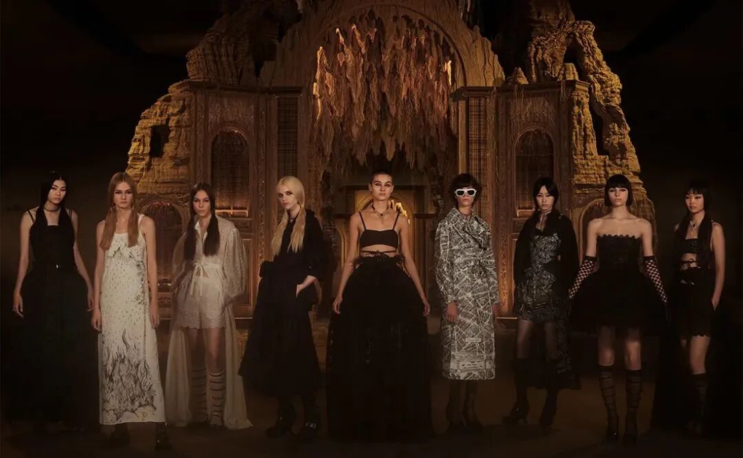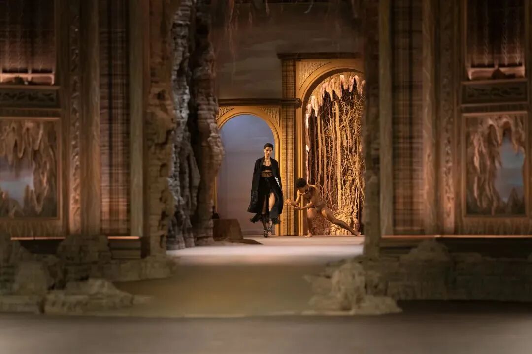 这场秀将将自然元素与建筑相结合,邀请法国艺术家 Eva Jospin为时装秀设计秀场,在昏暗的灯光下,一座巴洛克式洞窟雕刻矗立在秀场中央,充满神秘气息,穿越历史,连接着巴黎的过去与现在。