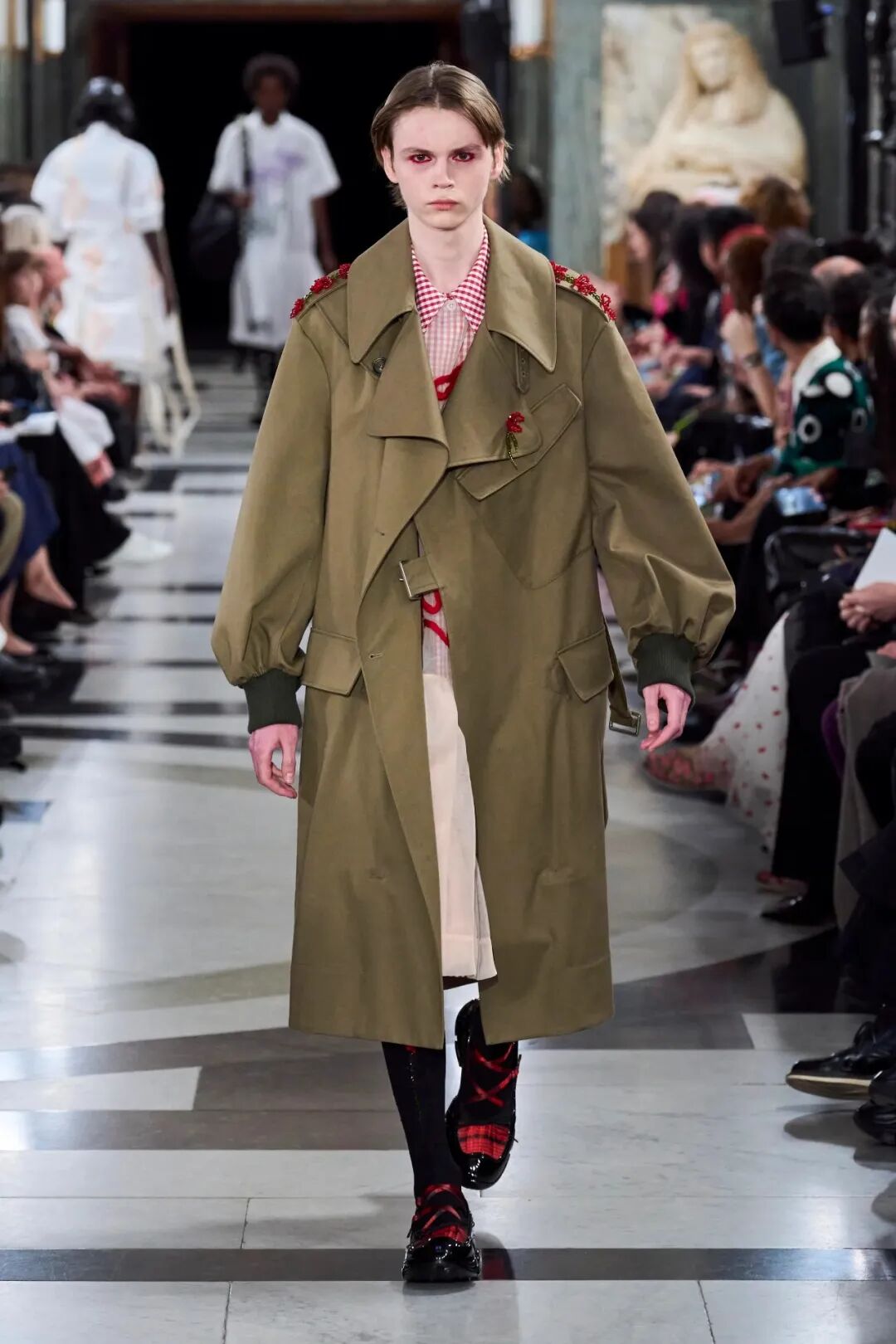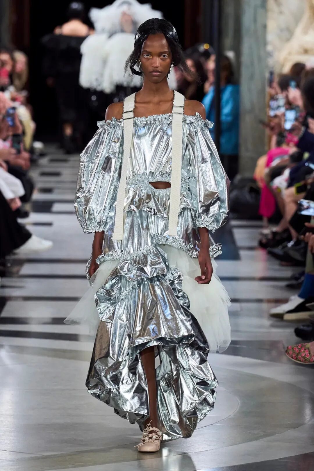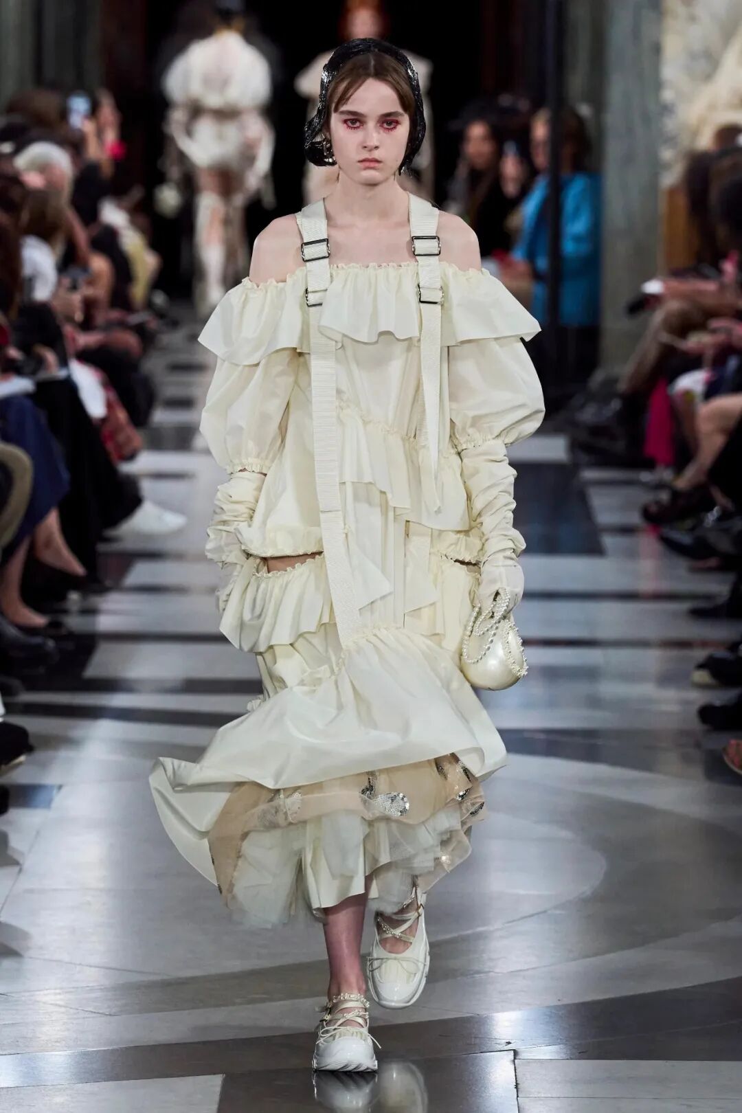 Simone Rocha选择的驾驭方式实际上是将降落伞带子穿在连衣裙和大号夹克上,并向我们展示了这些带子如何改变服装的形状,根据设计师的心情与喜好使之成为长或短的、不同体积感的服装。